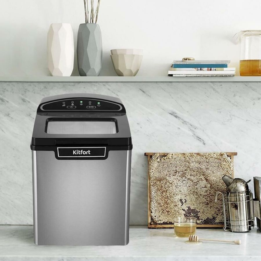 Ледогенератор Kitfort KT-1807 – прибор, который быстро генерирует лёд за 6 -13 мин. Его можно использовать дома для приготовления охлаждённых напитков или для охлаждения жидкостей. Мощность 105 Вт. Электропитание от бытовой сети. Цвет серебристый/черный. Размеры (ШхВхГ) 348х249х325 мм.