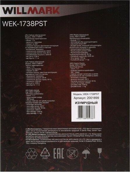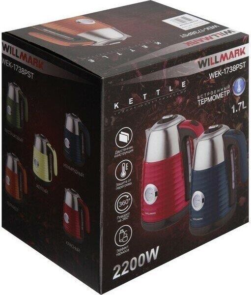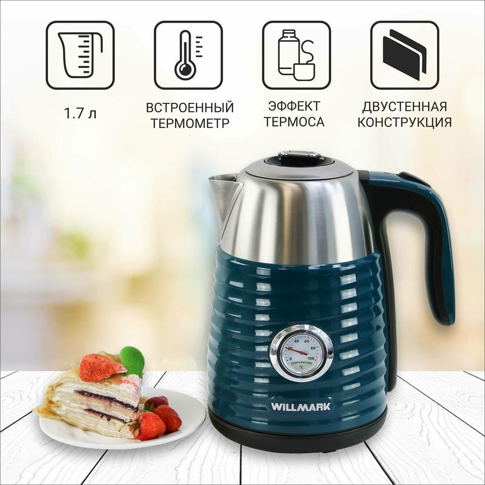 Чайник WILLMARK WEK-1738PST современный чайник с удобной ручкой, мощностью 2200Вт, объёмом 1,7 литра,с закрытым нагревательным элементом из нержавеющей стали. Удобен в эксплуатации, позволяет легко контролировать температуру воды благодаря встроенному термометру. Чайник электрический WEK-1738PST имеет двухстенную конструкцию, в которая наружняя часть выполнена из экологически безопасного пищевого пластика, внутренняя — из нержавеющей стали. Благодаря такой конструкции наружная поверхность чайника не нагревается, а при нагреве воды существенно снижается уровень шума и срок закипания. Технология термоса с двумя стенками позволит воде дольше оставаться горячей и снизит затраты на электроэнергию.