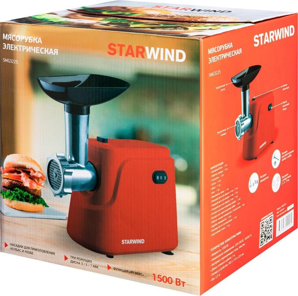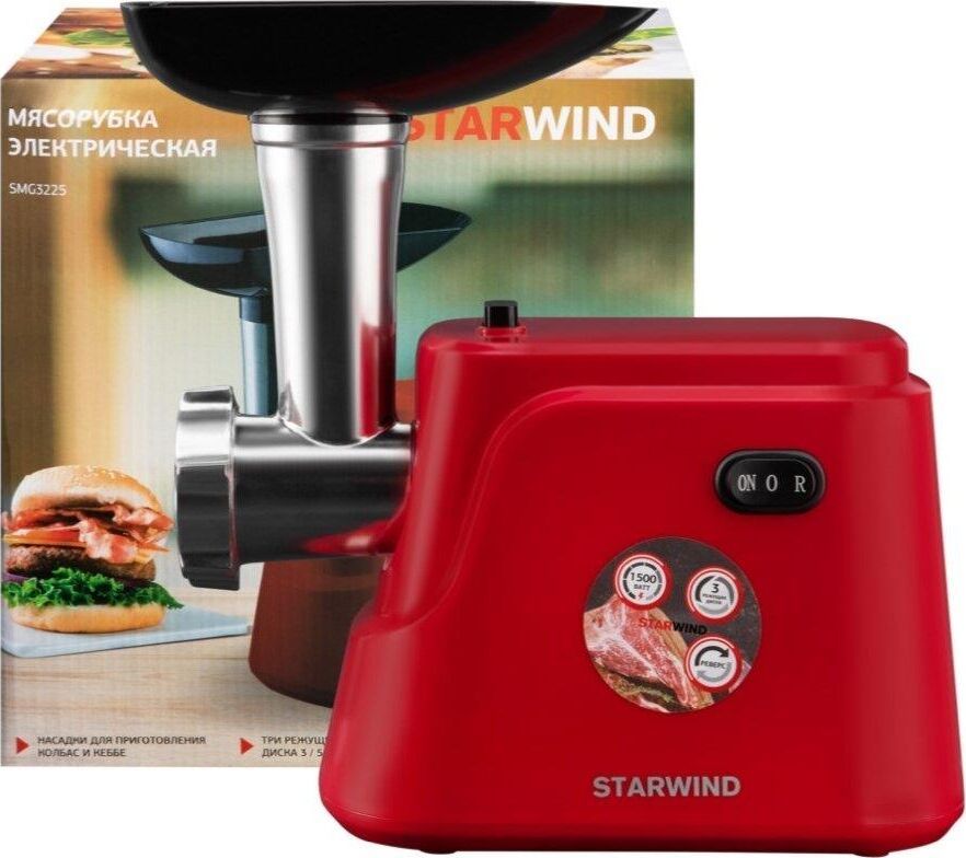 Максимальная мощность1500Вт Количество скоростей1 Функция реверсаДА Защита двигателя от перегрузкиДА Защита от перегреваДА Перфорированный диск для фарша3 Насадка для приготовления домашних колбасДА Насадка для кеббеДА Насадка для шинковкиДА Вес1.8кг Цвет мясорубкикрасный Материал лоткапластик Материал корпусапластик Прорезиненные ножкиДА Длина сетевого шнура1м ТолкательДА Габариты упаковки (ед) ДхШхВ0.28x0.23x0.29м Срок гарантии12 мес.