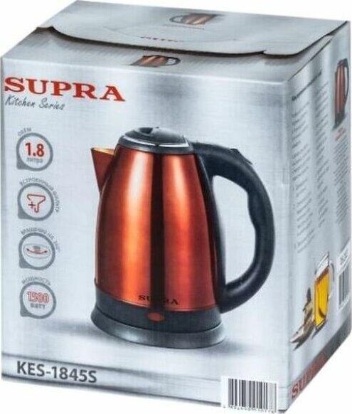 SUPRA KES-1845S Максимальный объем, л 1,8 Тип нагревательного элемента закрытый Способ открывания крышки вручную Подставка с вращением на 360 есть Длина сетевого шнура, м. 0,75 Функции Отключение при закипании есть Отключение при снятии есть Отключение при отсутствии воды есть Комплектация Комплектация чайник, гарантийный талон, инструкция на русском языке Корпус Материал корпуса нержавеющая сталь Энергопотребление Потребляемая мощность, Вт. 1500 Электропитание, в., Гц. 220-240, 50