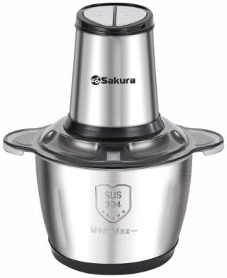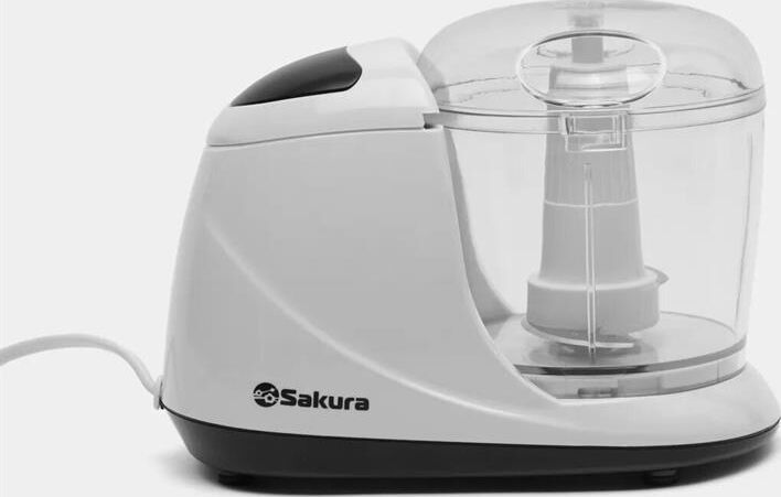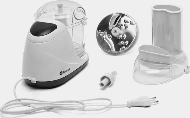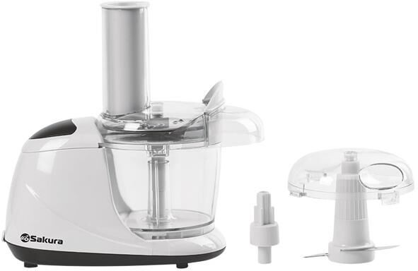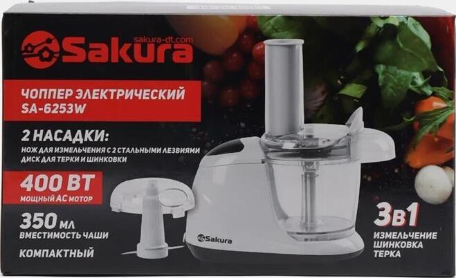 Чоппер с 2 доп. насадками. 400 Вт, 0,35 л, пластиковая чаша, 2 лезвия из нержавеющей стали, насадка для взбивания яиц и насадка для нарезки овощей, одна скорость, цвет белый.