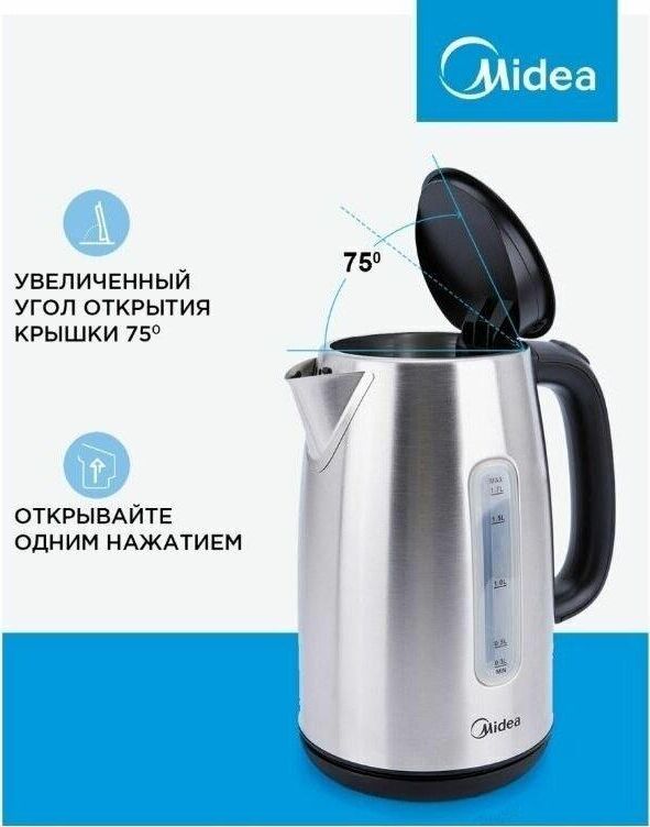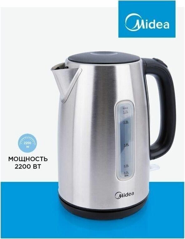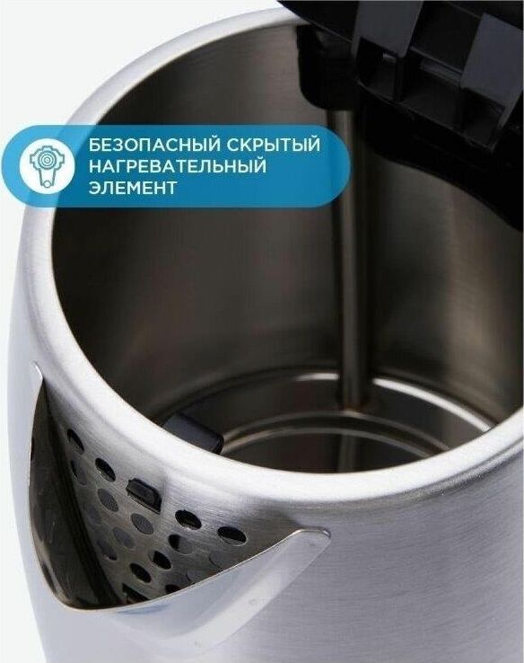 Тип электрочайник. Объем 1.7 л. Потребляемая мощность 2200 Вт. Нагревательный элемент скрытый. Покрытие нагревательного элемента нержавеющая сталь. Индикатор уровня воды. Открывание крышки кнопкой. Материал сталь.