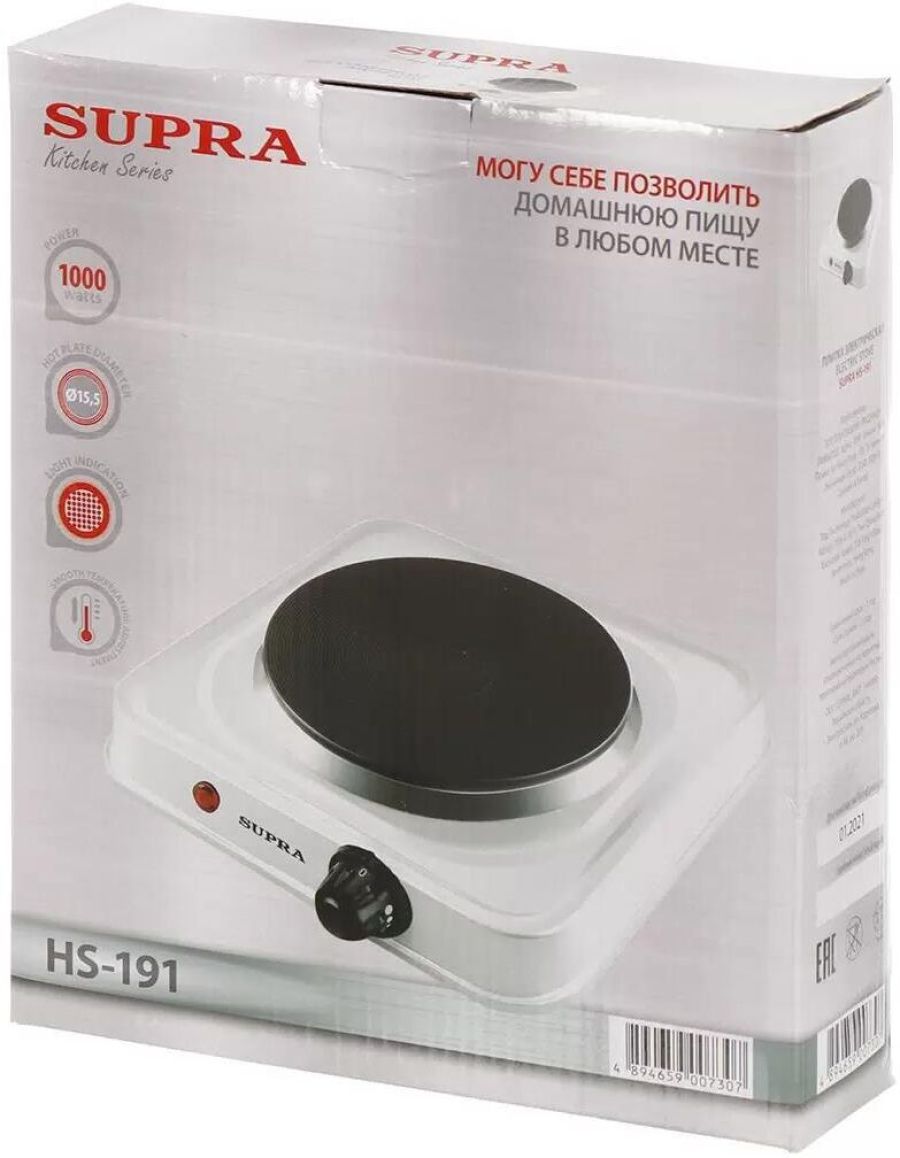 SUPRA HS-191 Основные характеристики Тип конфорок чугун Количество конфорок 1 Диаметр конфорок, см 15,5 Тип управления механическое Регулировка мощности есть Индикация Индикация включения в сеть есть Комплектация Комплектация плитка, гарантийный талон, инструкция на русском языке Корпус Материал корпуса металл с эмалевым покрытием Габариты и вес Вес в упаковке, кг. 1.4 Размер упаковки, см. (ВхШхГ) 6.5x22.5x26.5 Энергопотребление Потребляемая мощность, Вт. 1000 Электропитание, в., Гц. 220-240, 50