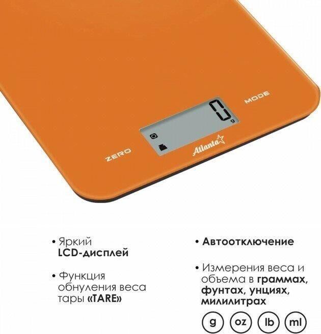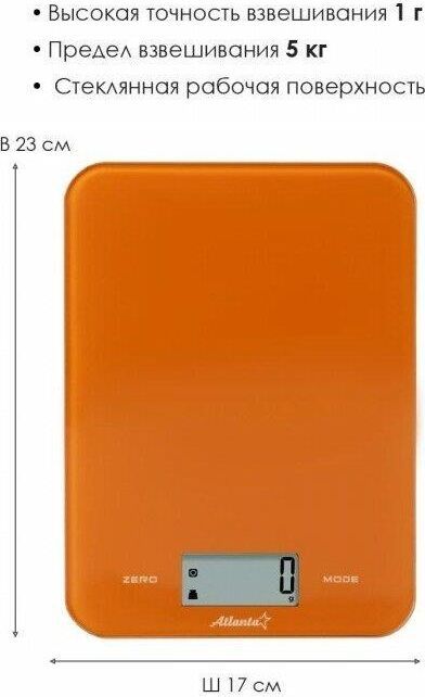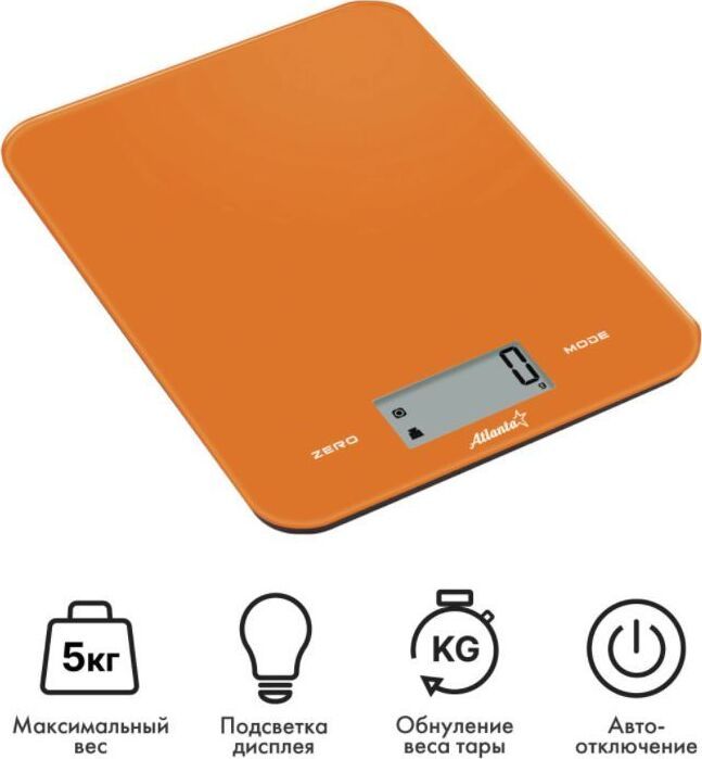 ATLANTA ATH-6197 (ORANGE) Стеклянная рабочая поверхность, максимальный вес 5 кг с шагом 1 г, LED-дисплей. ПОЛНОСТЬЮ ЭЛЕКТРОННЫЙ Полностью электронный принцип взвешивания на высокоточных сенсорах гарантирует точность измерения веса, а благодаря отсутствию механических механизмов, весы прослужат многие годы