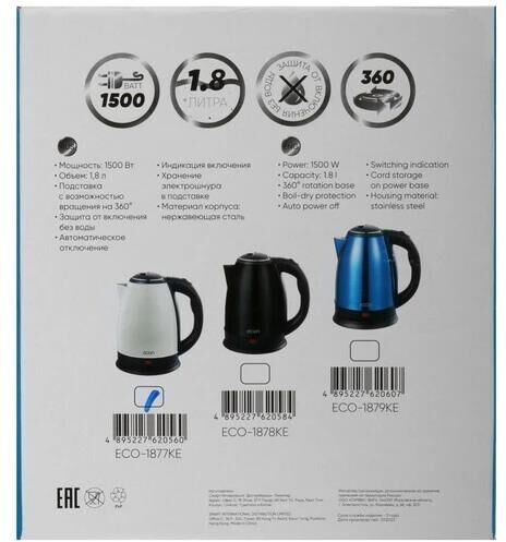 Максимальный объем, л. 1,8. Подставка с вращением на 360 есть. Хранение сетевого шнура в подставке есть. Отключение при закипании есть. Отключение при отсутствии воды есть. Индикатор включения есть. Комплектация чайник, гарантийный талон, инструкция на русском языке. Материал корпуса нержавеющая сталь. Цвет белый с черным. Потребляемая мощность, Вт. 1500. Электропитание, В., Гц. 220-240, 50.