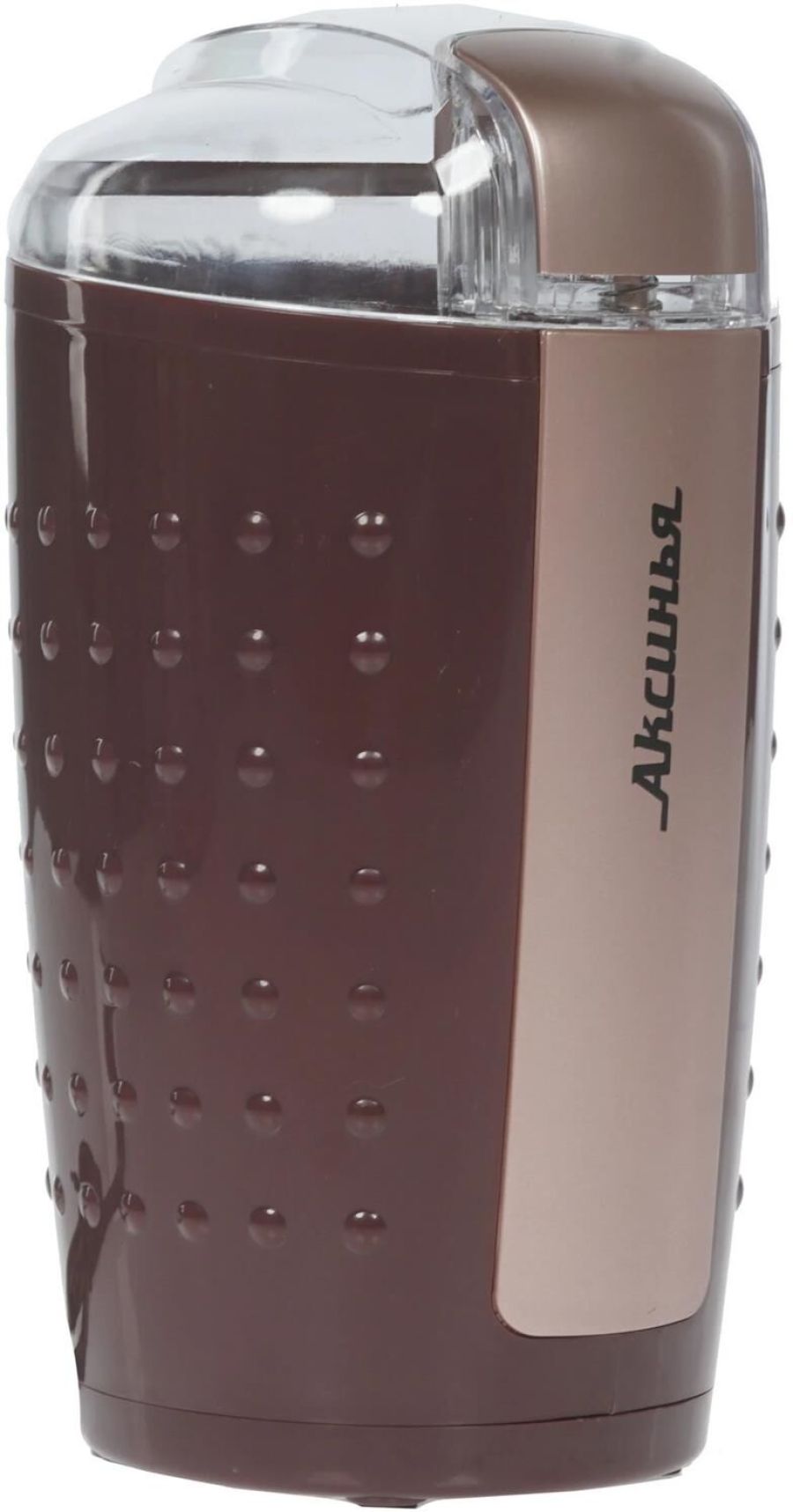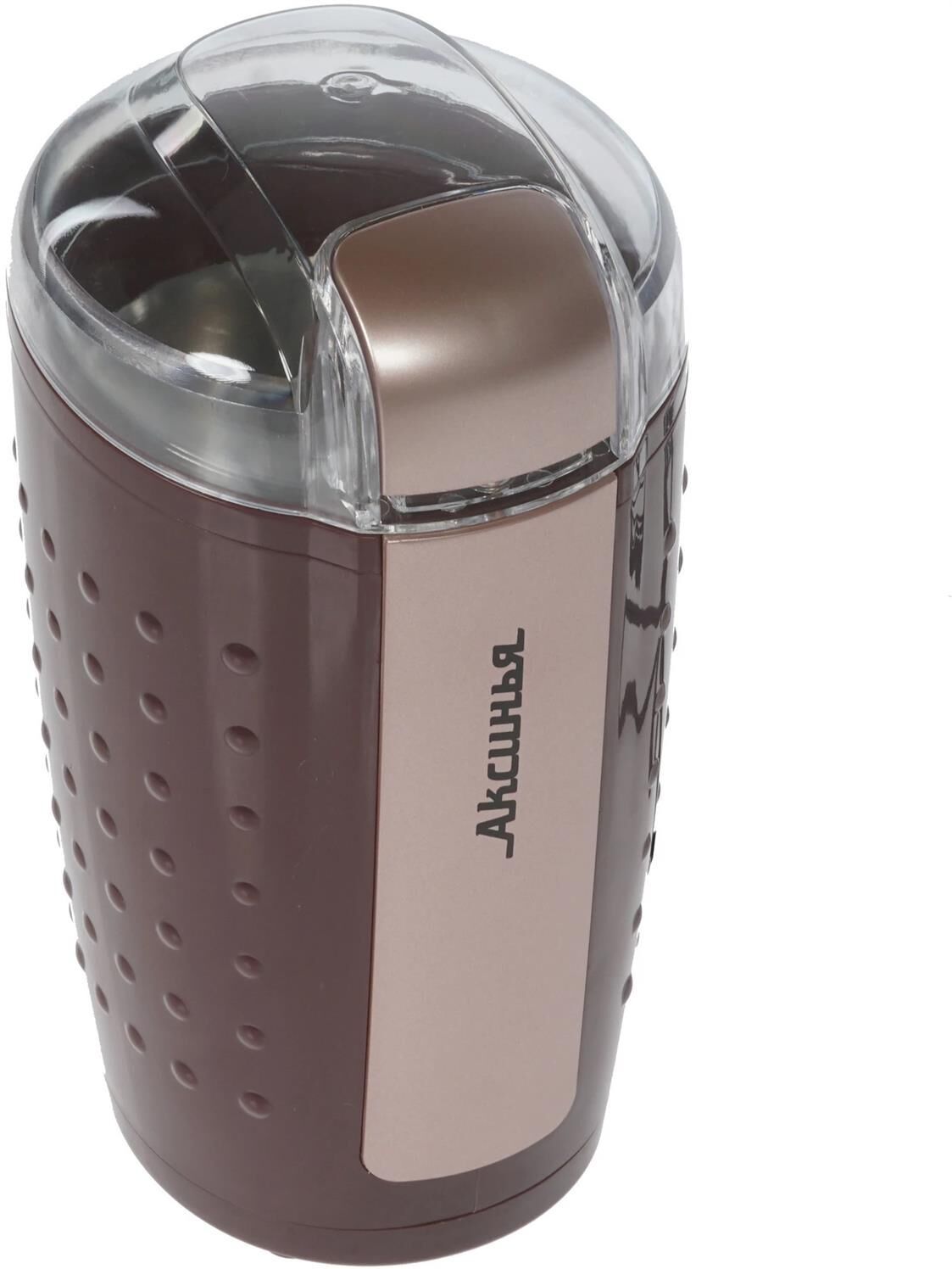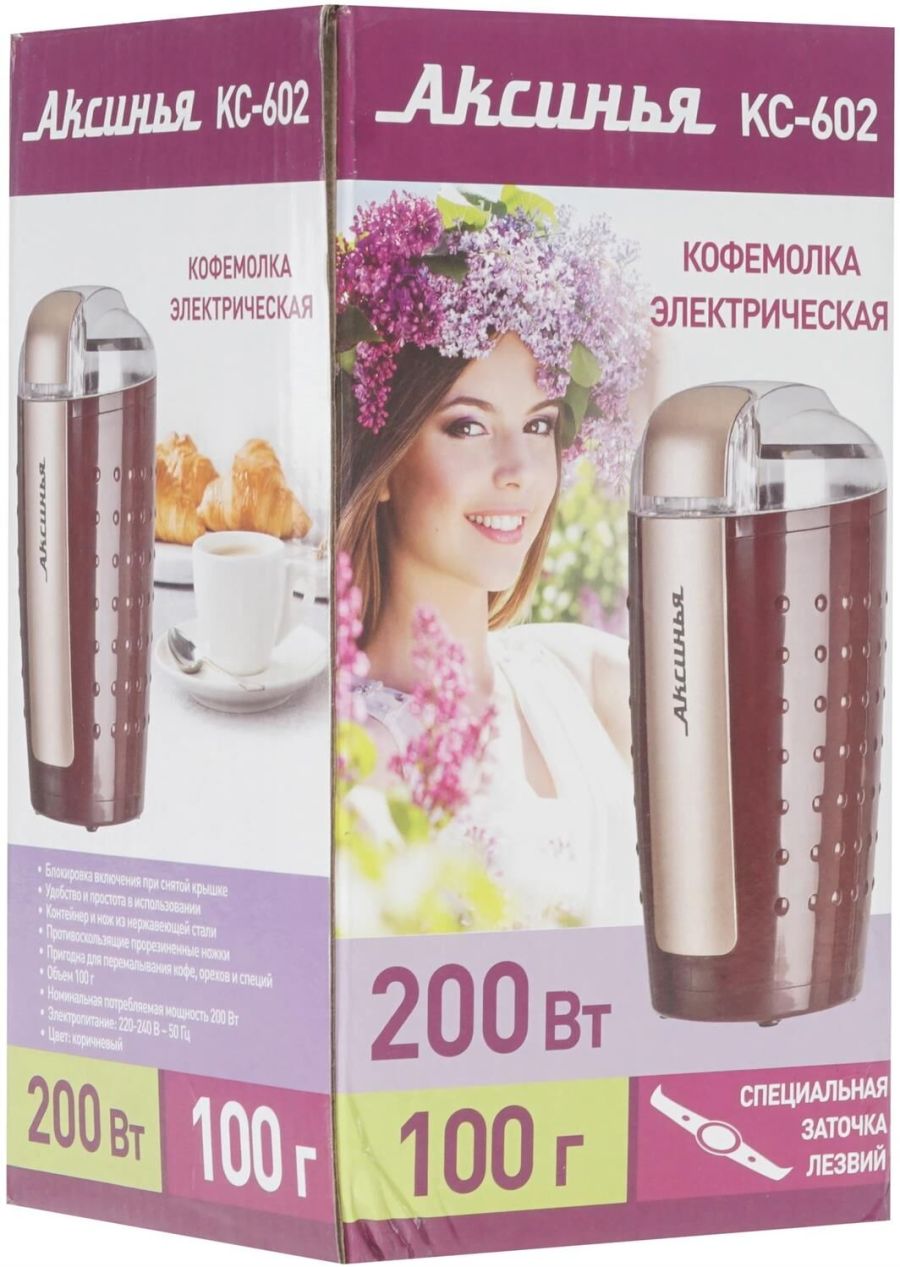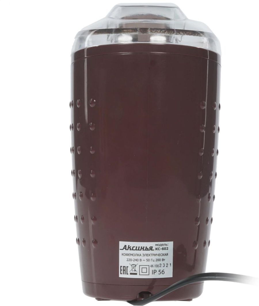 АКСИНЬЯ КС-602 коричневый Параметры Номинальная потребляемая мощность 200 Вт Объем 100 г Описание Кофемолка - устройство для размола зерен кофе. Принцип работы роторной (ножевой) кофемолки состоит в том, что кофейные зерна дробит, одновременно перемешивая, вращающийся с большой скоростью острый стальной нож. Тонкость помола зерен определяется временем работы кофемолки Пригодна для перемалывания кофе, орехов и специй Контейнер и нож из нержавеющей стали Противоскользящие прорезиненные ножки Блокировка включения при снятой крышке Цвет: коричневый