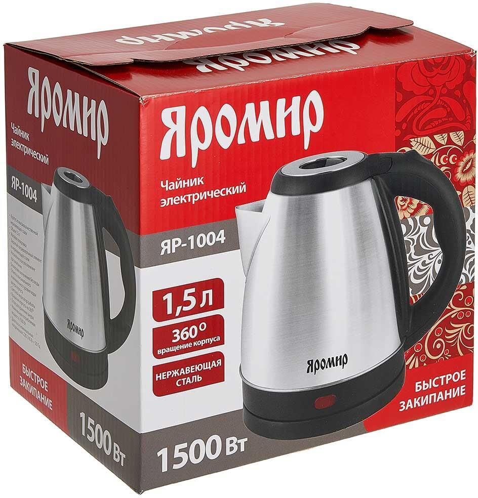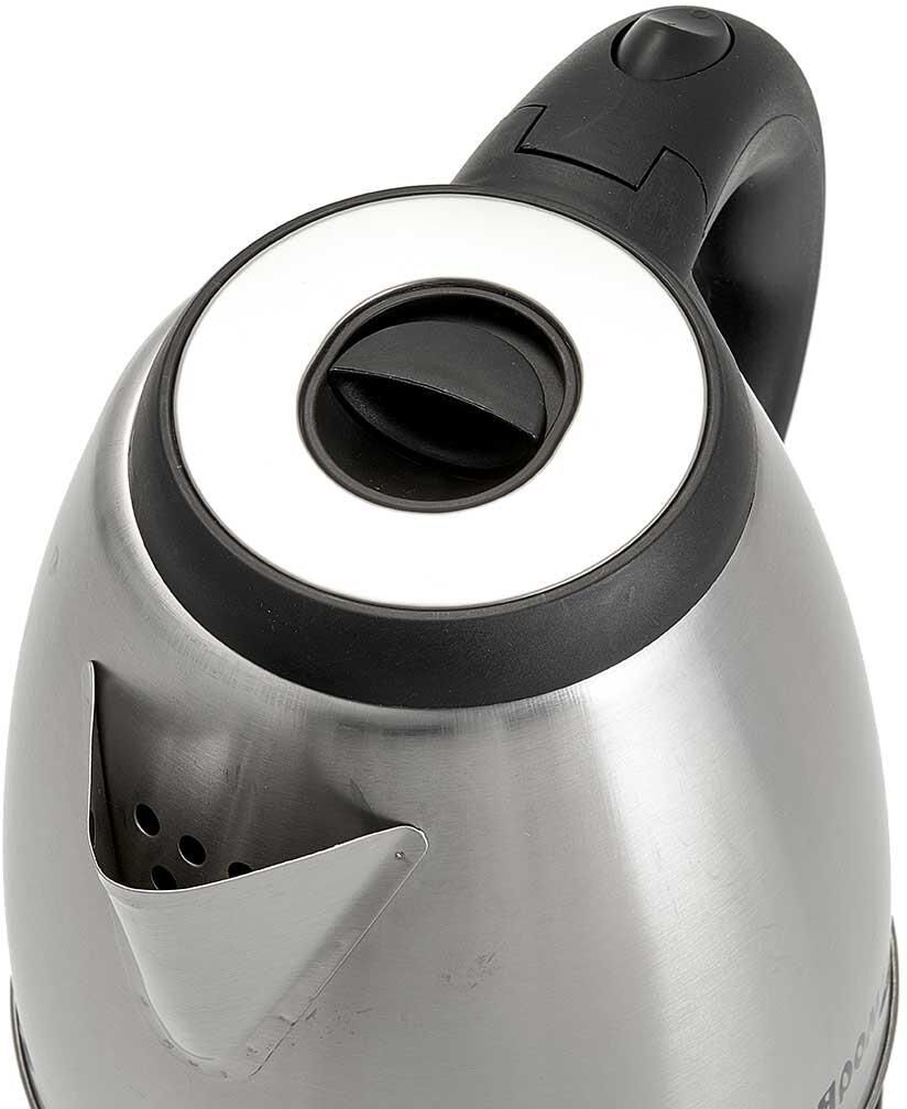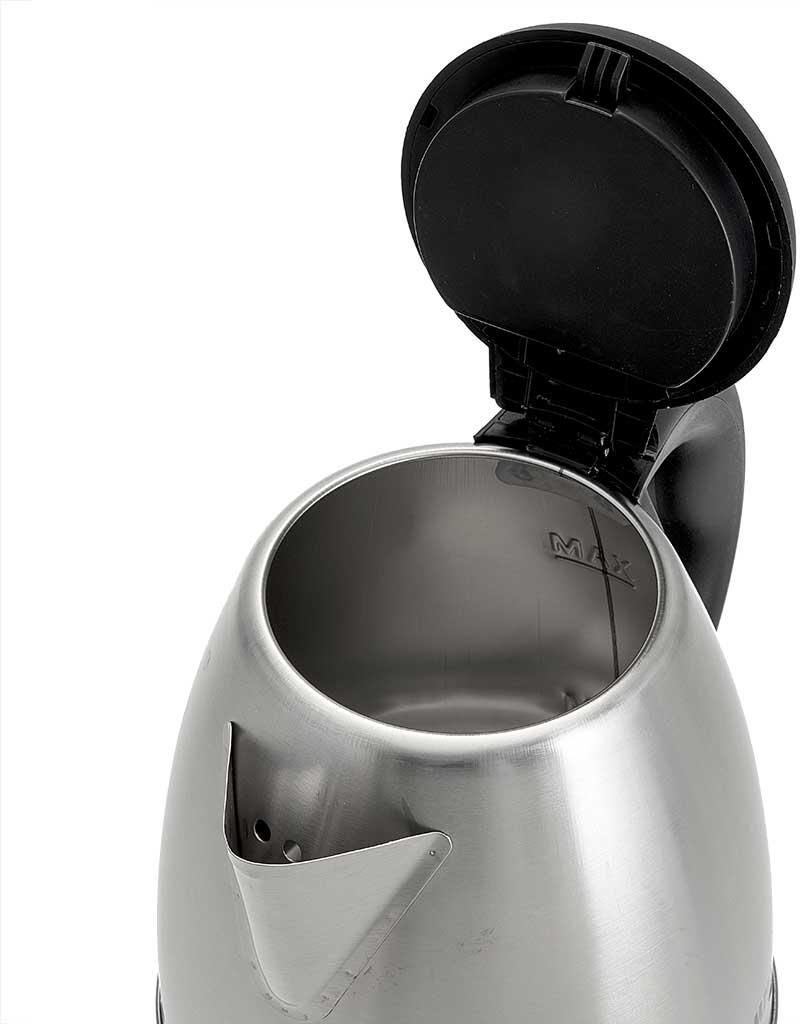 Объем 1,5 л. Номинальная потребляемая мощность 1800 Вт. Закрытый нагревательный элемент. Корпус из высококачественной нержавеющей стали. Матовая полировка. Вращение корпуса на 360°. Цвет базы, крышки и ручки: черный. Световой индикатор работы. Отсек для хранения электрошнура. Автоматическое отключение при закипании. Блокировка включения без воды.
