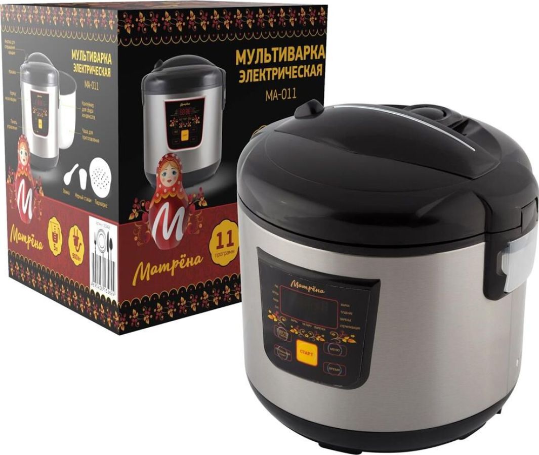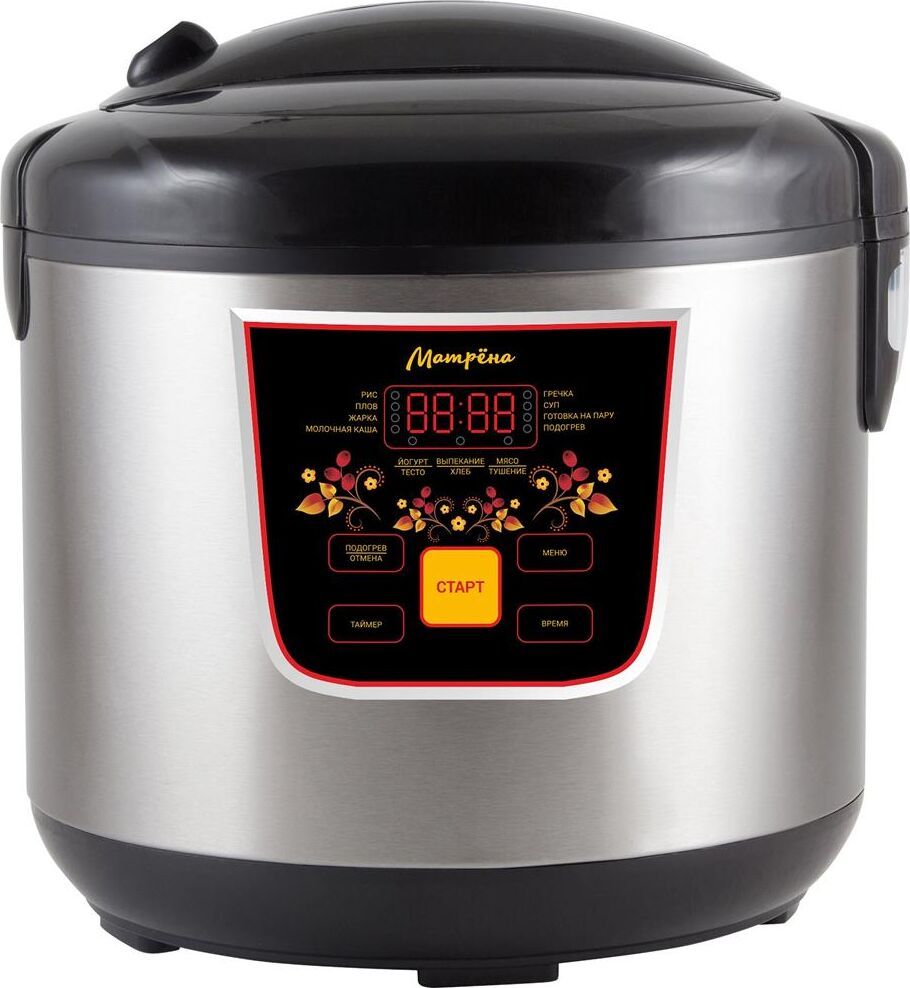 Объем 5 л Чаша с антипригарным покрытием Отложенный старт Поддержание температуры Автоматическое отключение системы при перегреве LCD дисплей В комплекте: мерный стаканчик, ложка, контейнер-пароварка 11 программ приготовления: Рис/Крупы/Каша/Суп/Варка/Приготовление на пару/Выпекание/Стерилизация/Варение/Тушение/Жарка Съемный шнур питания Корпус из нержавеющей стали Мощность 900 Вт