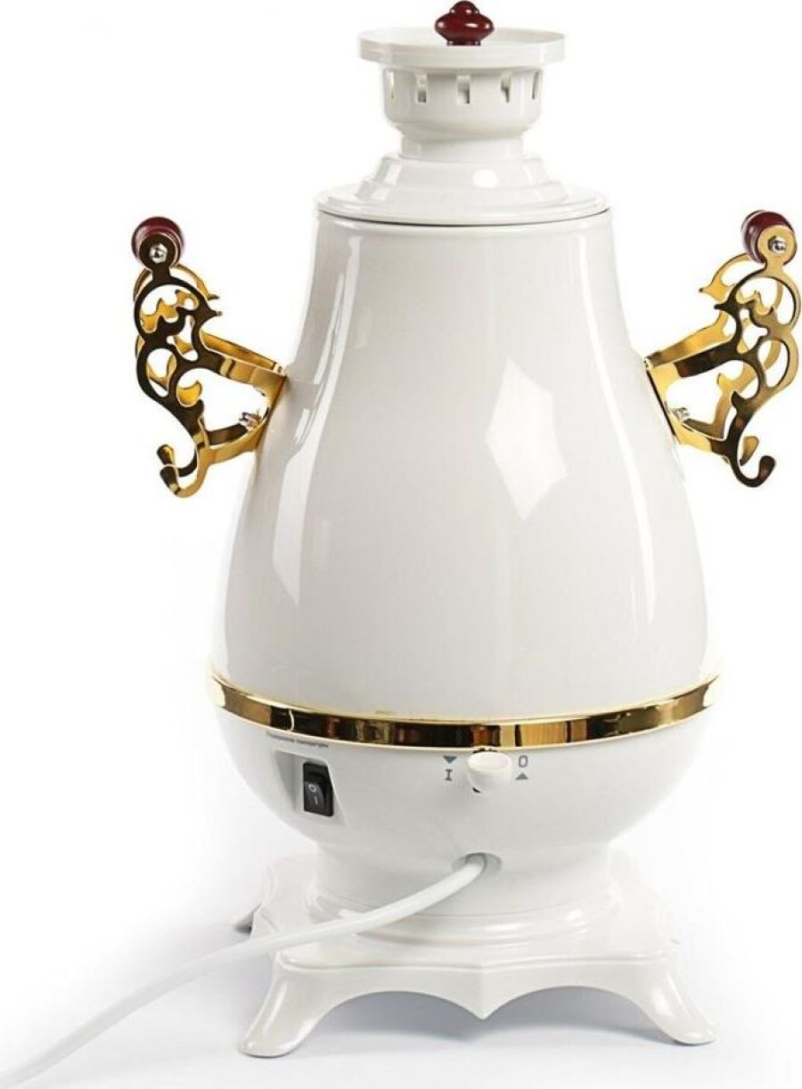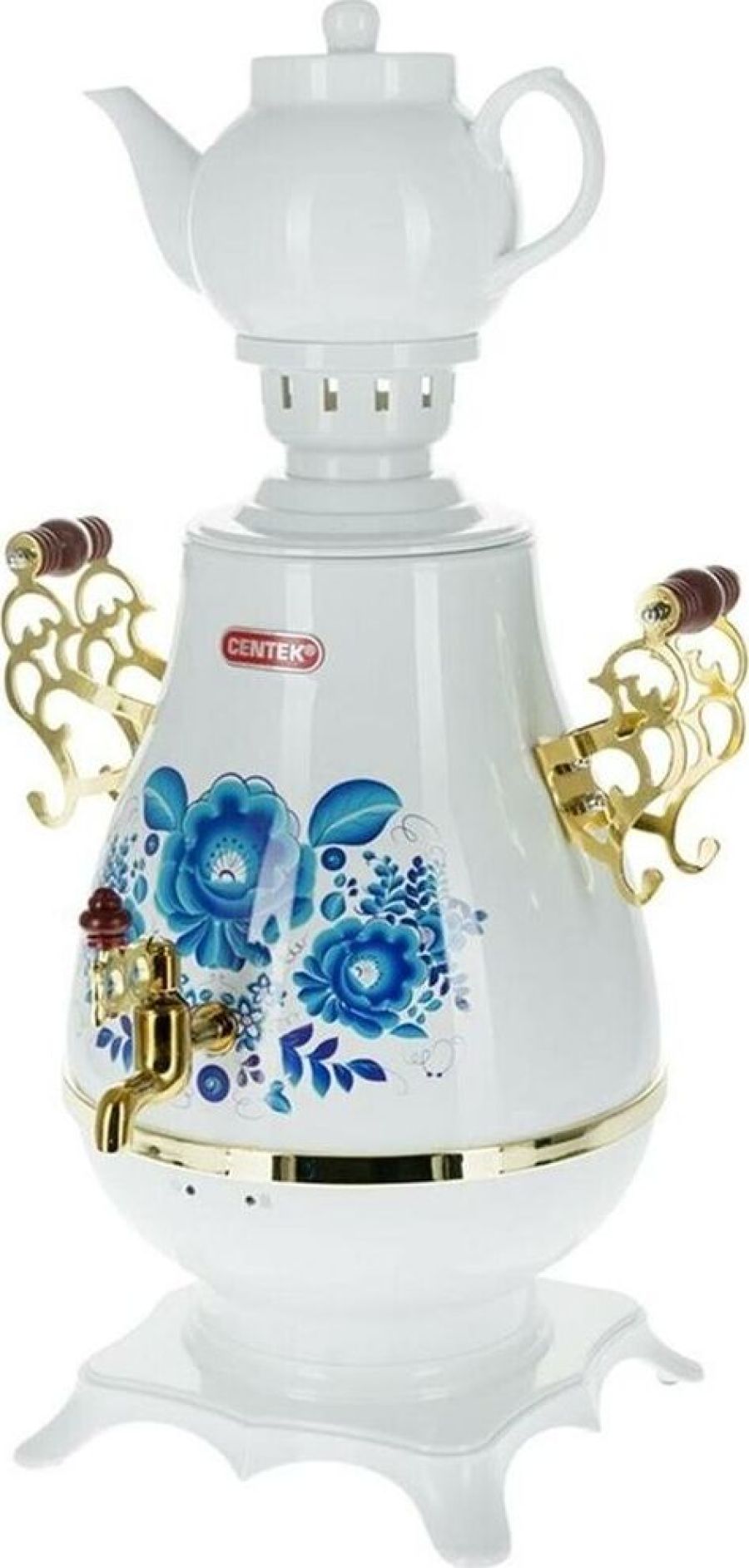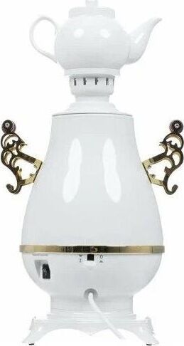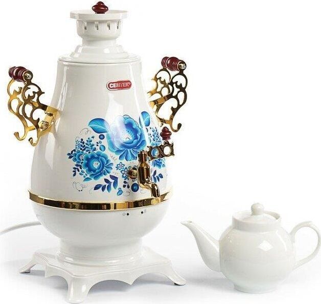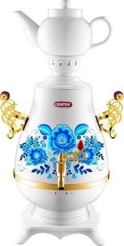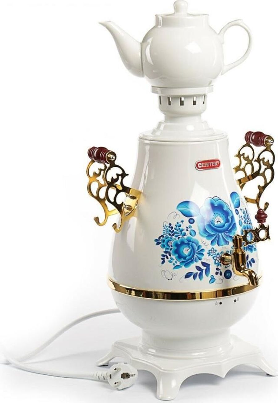 Самовар Centek СТ-0092 A (белый+рисунок+золото), Максимальный объем4 л Максимальная мощность2300 Вт Функция поддержания температуры Скрытый нагревательный элемент Керамический заварочный чайник1 л Съемный фильтр для заварки LED-индикаторы работы и нагрева Хромированная отделка корпуса Защита от включения без воды Автоматическое выключение Защита от перегрева