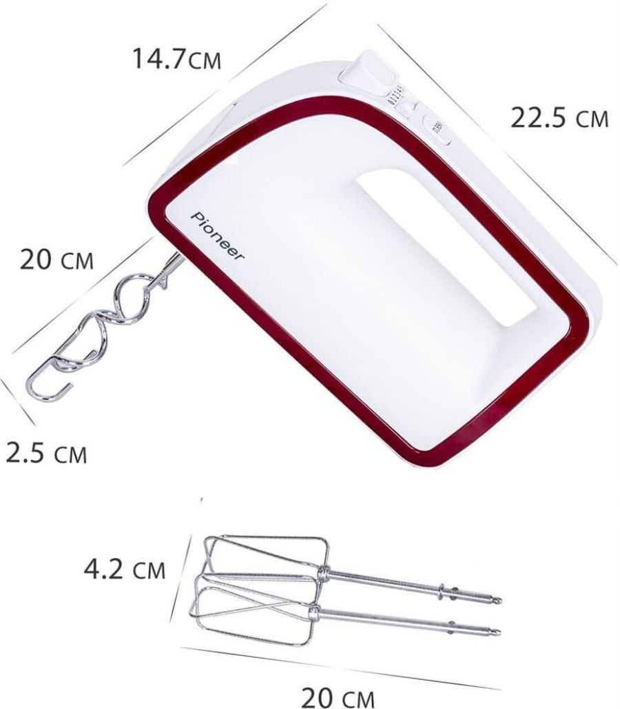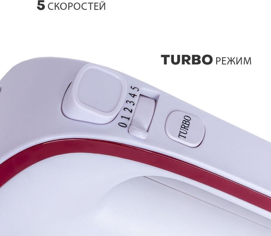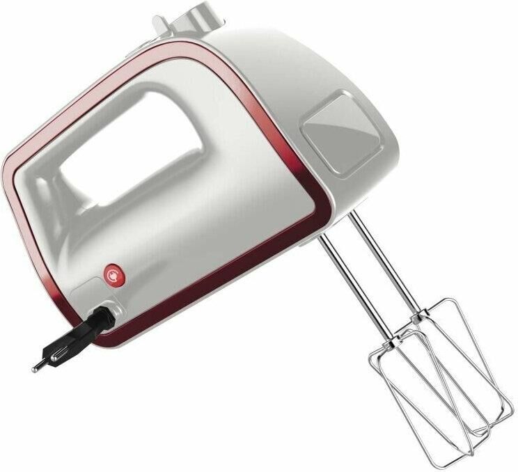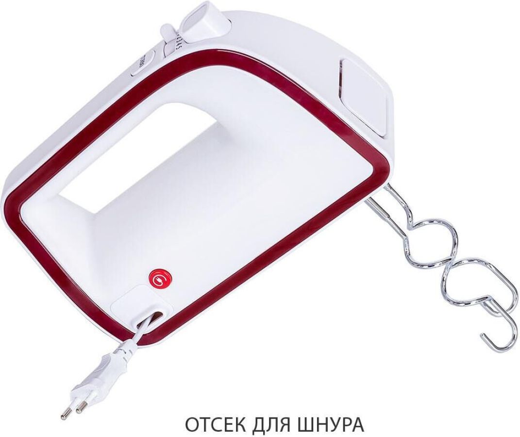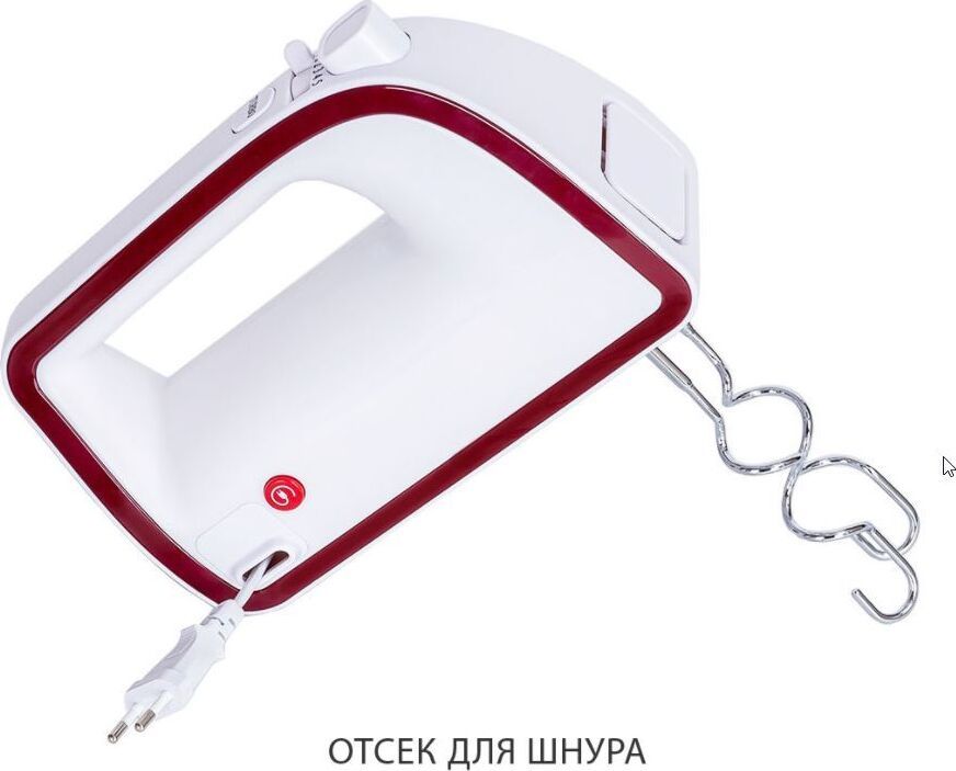 Миксер, максимальная мощность: 350 Вт, 5 скоростей, переключатель скоростей, режим Турбо, венчики для взбивания яиц и крема, крючки для замеса теста, простота в использовании и чистке, хранение шнура в корпусе миксера