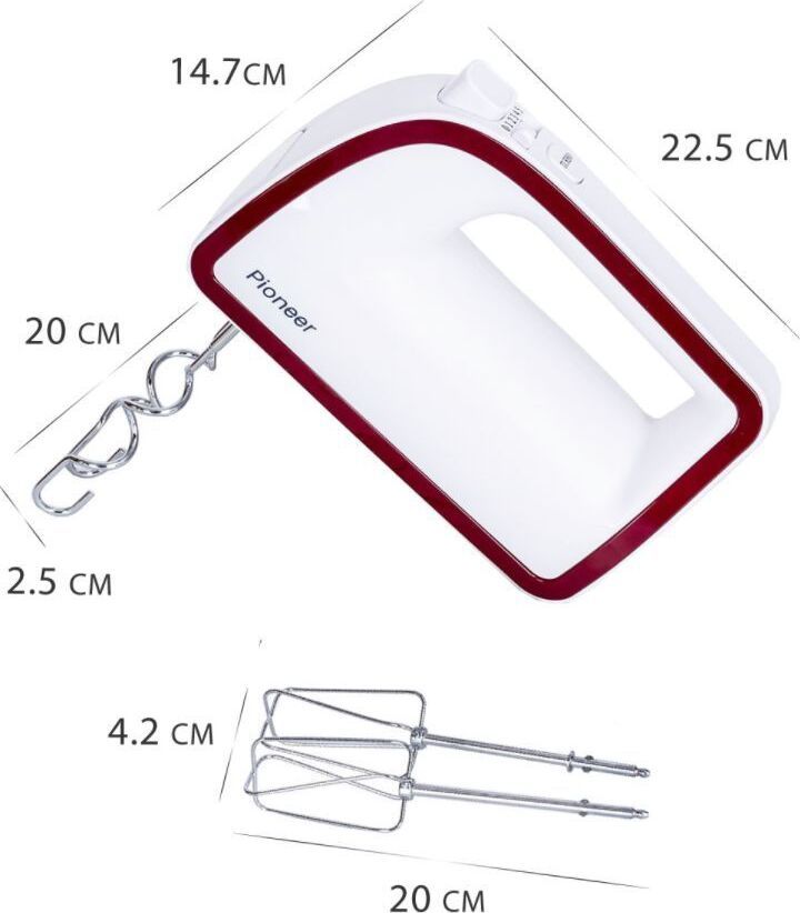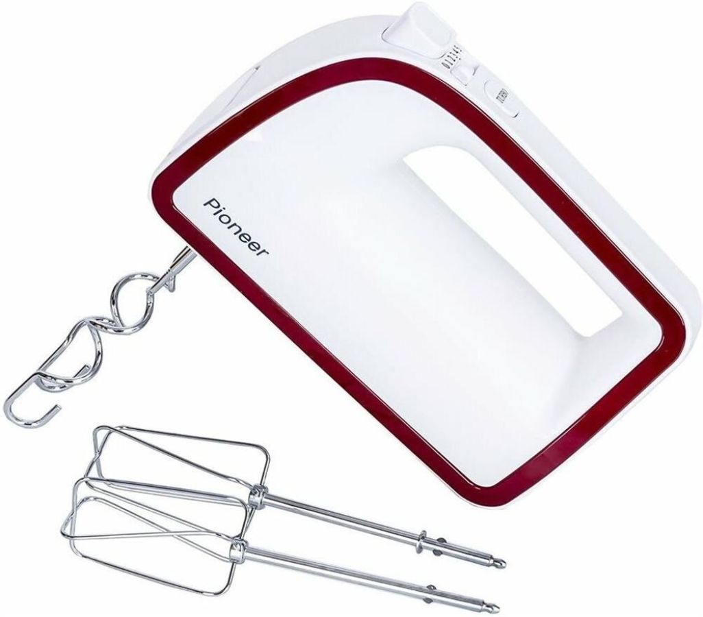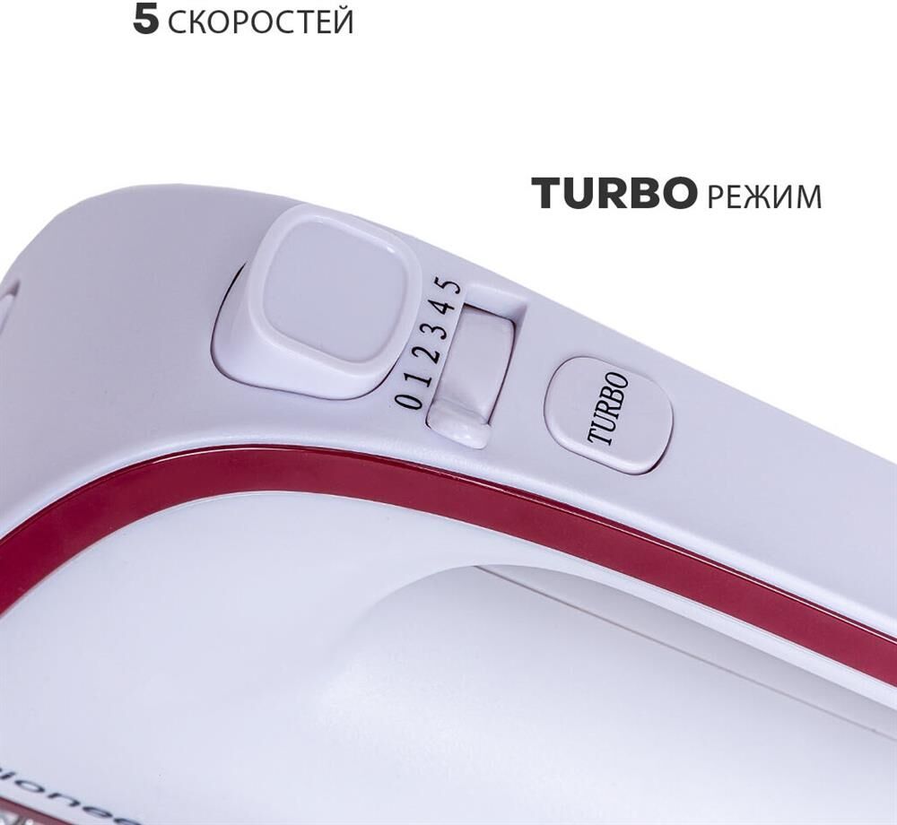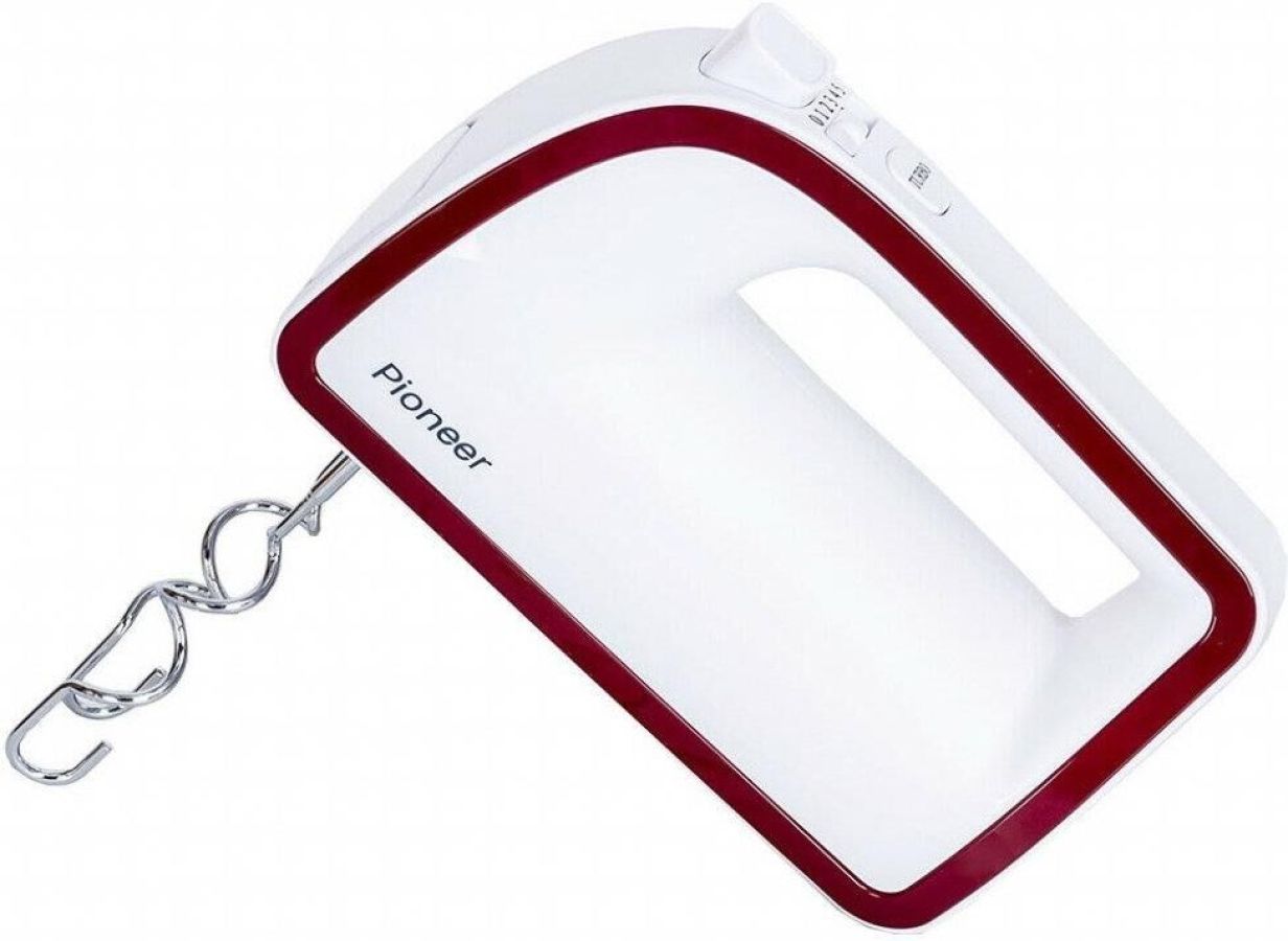 Миксер, максимальная мощность: 350 Вт, 5 скоростей, переключатель скоростей, режим Турбо, венчики для взбивания яиц и крема, крючки для замеса теста, простота в использовании и чистке, хранение шнура в корпусе миксера
