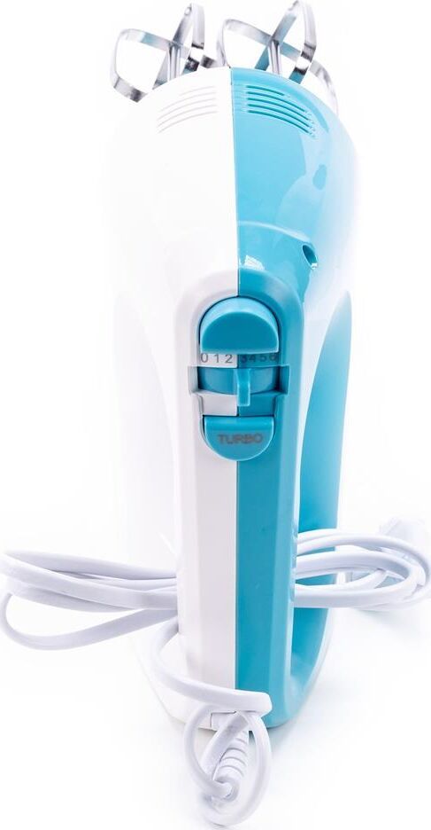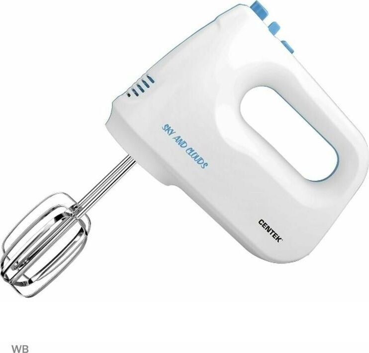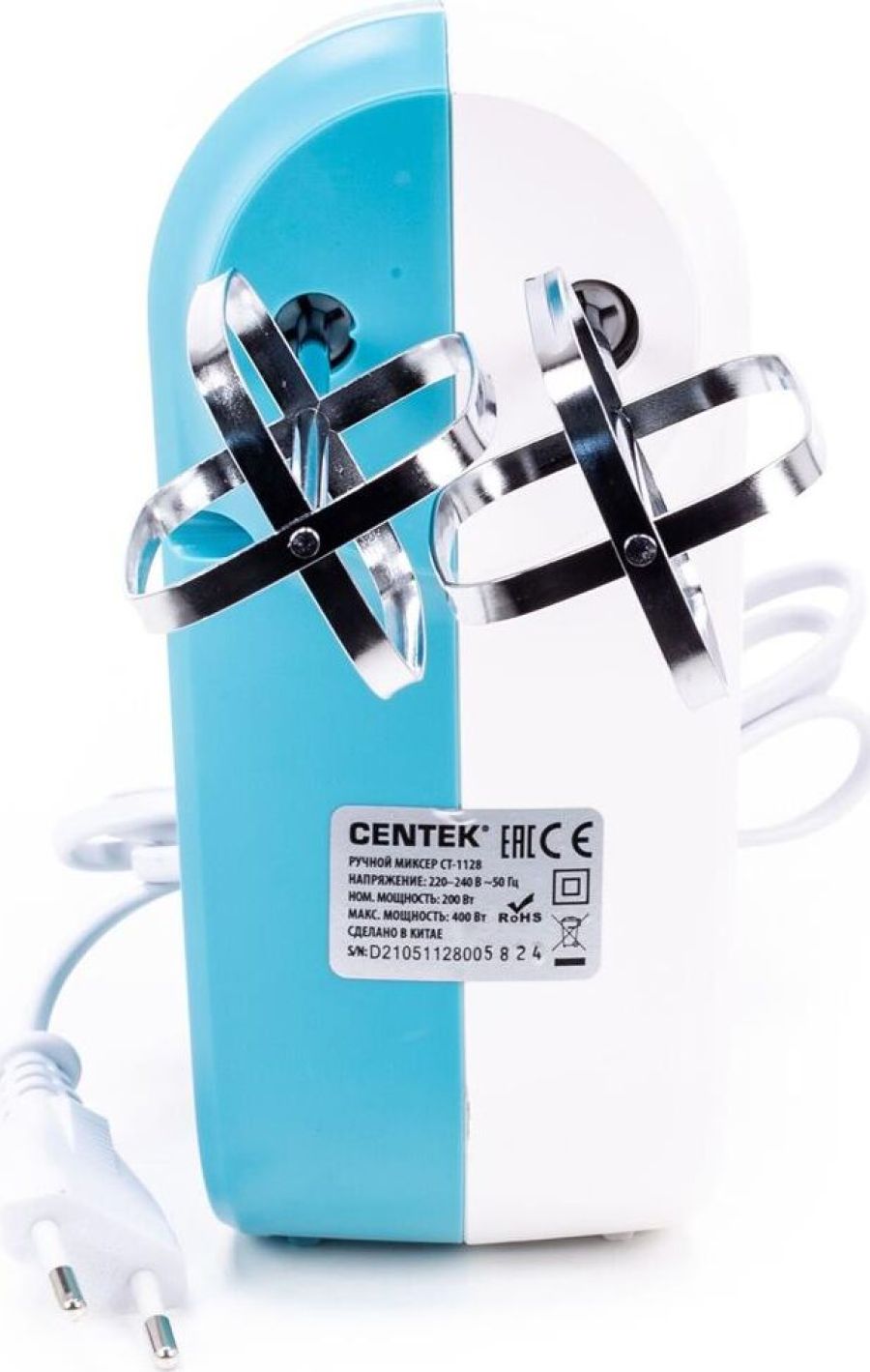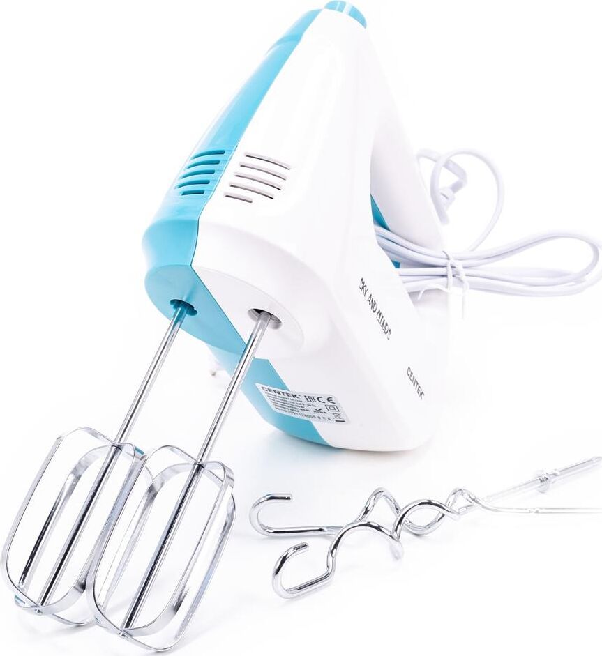 Миксер CENTEK CT-1128 (белый) Мощность: 400 Вт Количество скоростей: 6 Турбо режим Кнопка освобождения насадок Пара насадок для взбивания Пара насадок для замешивания Материал корпуса: высококачественный прочный Пластик Материал насадок: высококачественная Нержавеющая Сталь Экологичный пластиковый корпус Электропитание 220-240 В ~ 50/60 Гц Цвет: Белый с Голубым Срок гарантии: 12 месяцев
