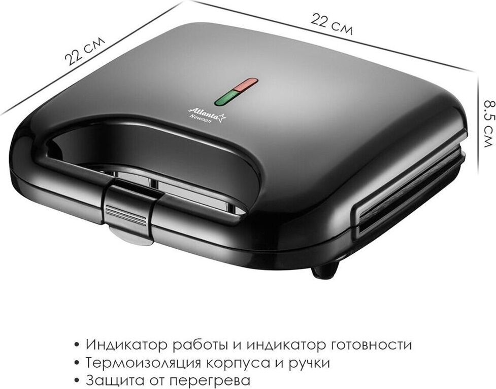 ATLANTA ATH-1078 (BLACK) Антипригарное покрытие Компактное хранение Защита от перегрева Световой индикатор работы Световой индикатор готовности использования Дополнительная термоизоляция корпуса Кабель питания 70см Номинальная мощность 750 Вт 230 B ~ 50 Гц
