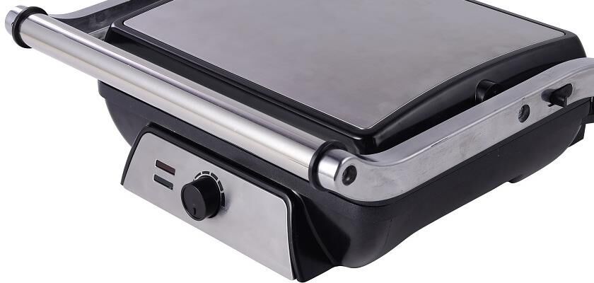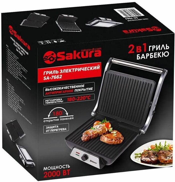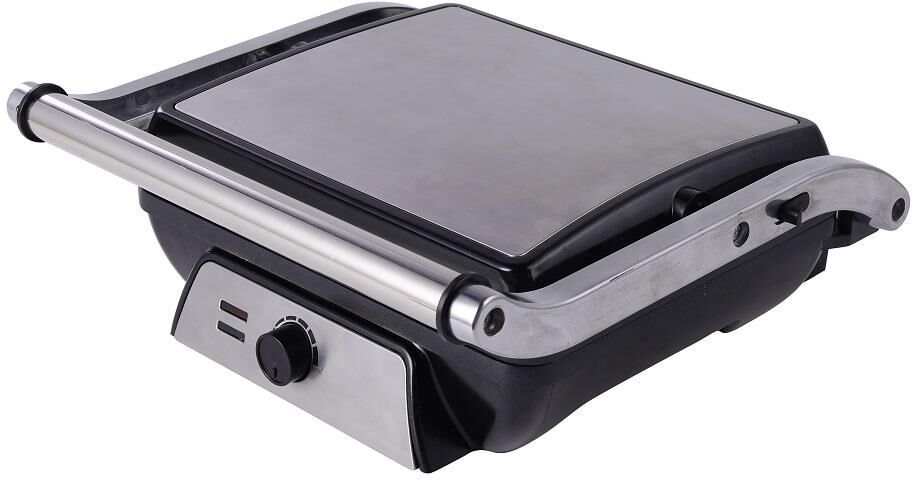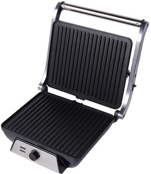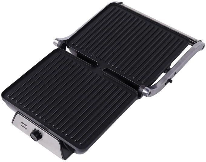 Гриль электрический, мощность 2000 Вт, регулируемый термостат (максимальная температура 240°С), 2 рифленые панели для жарки, размер панели 29,7х23,6 см, антипригарное покрытие, открытие панелей на 180° (возможность приготовления на 2 пластинах одновременно), индикатор работы, прорезиненные ножки. Корпус из нержавеющей стали и термостойкого пластика. Комплектация: резервуар для сбора масла.