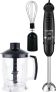 Погружной блендер, мощность 950W, пульсовый режим работы, 2 скорости, металлическая нога блендера, венчик для взбивания, чаша объемом 1250 мл с ножом из 4 лезвий для рубки и измельчения, автоматическая блокировка при неправильно установленной насадке.