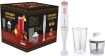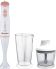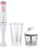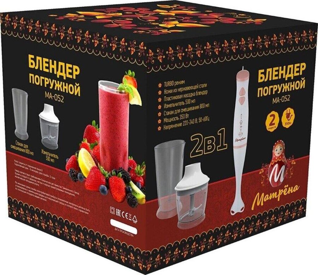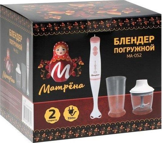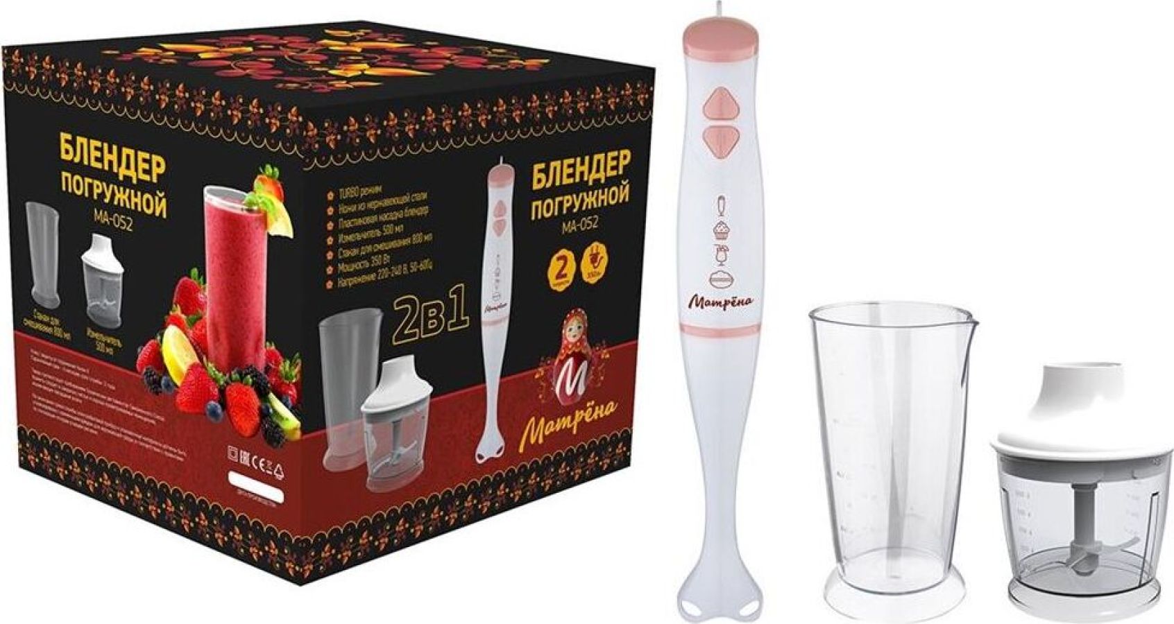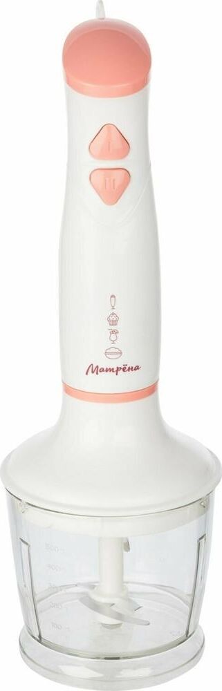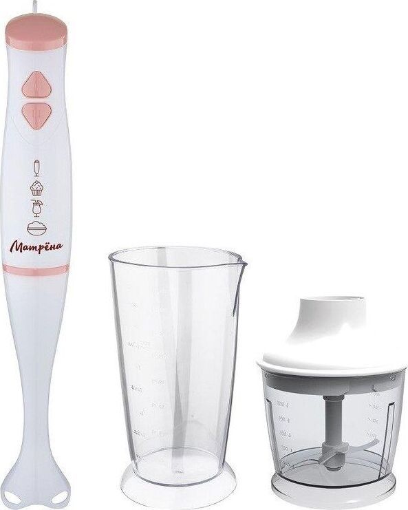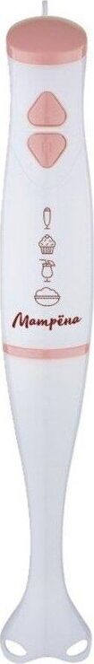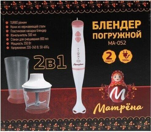 2 скорости работы. Ножи из нержавеющей стали. Пластиковая насадка блендер. Мощность 350Вт. Измельчитель 500 мл. Стакан для смешивания 800 мл.
