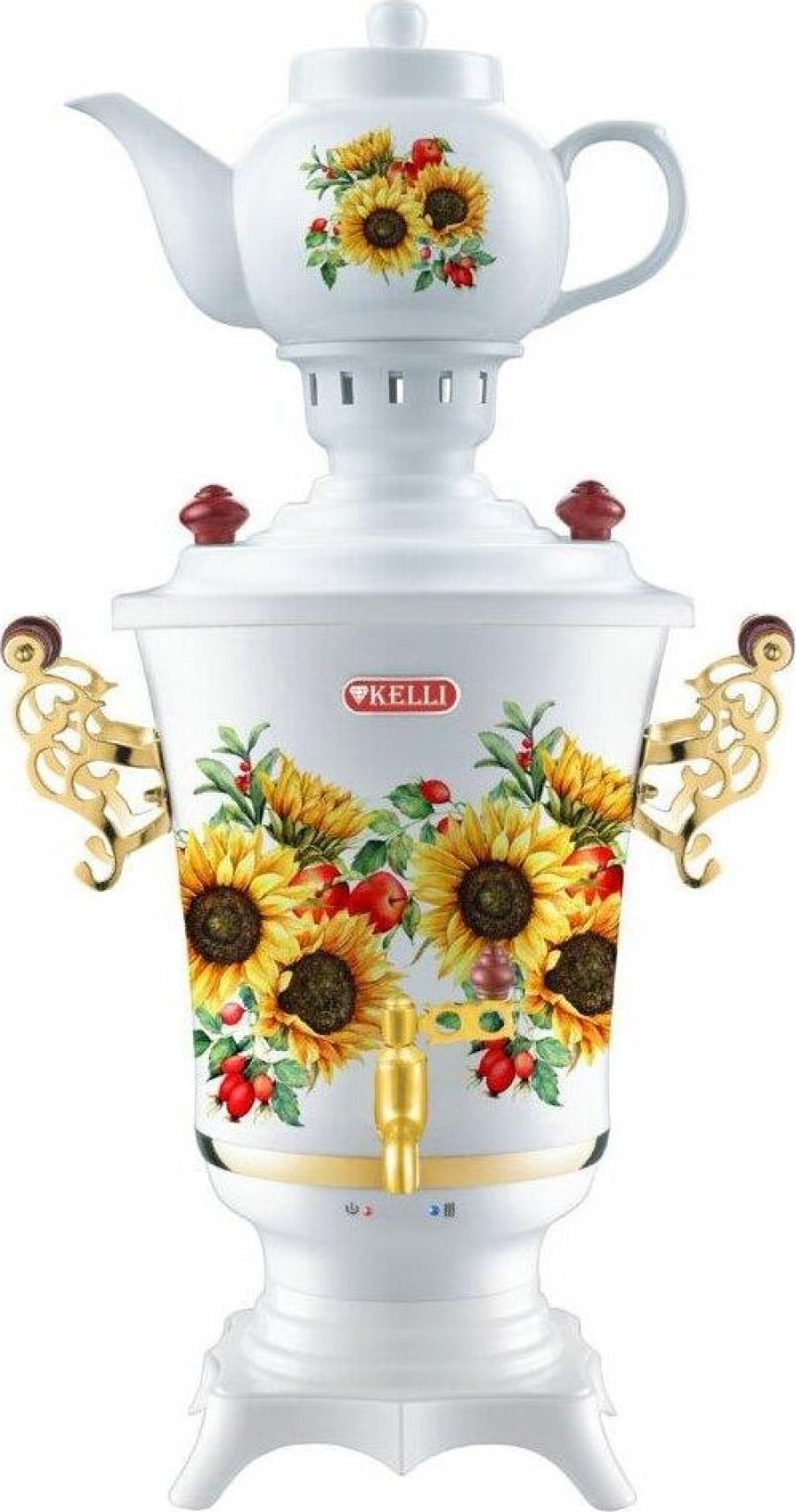 Электрический самовар с заварочным чайником; Объем: 4 л; Заварной чайник: 0,9 л; Раздельная нагревательная система; Кнопки вкл./выкл. и поддержания температуры; Функция автоматического кипячения и поддержания температуры; Закрытый нагревательный элемент; Пластиковый корпус; Заглушка на самовар; Удобные ручки для транспортировки; Удобный хромированный кран/ Световые индикаторы; Защита от перегрева при выкипании воды