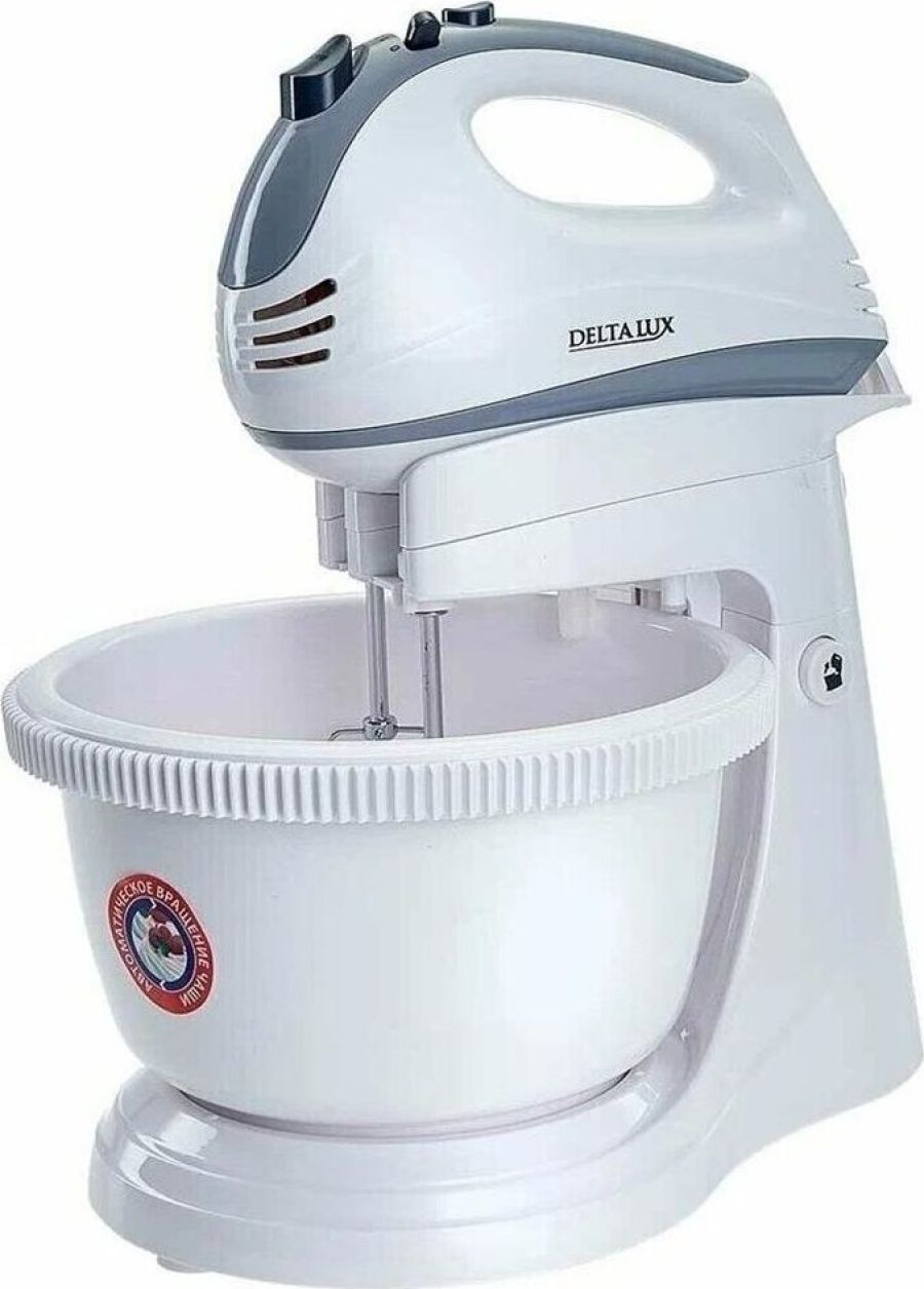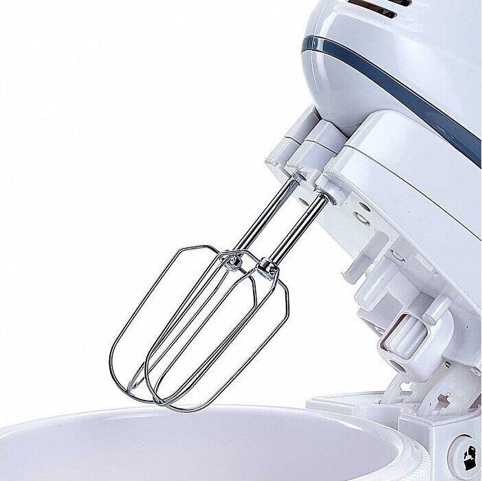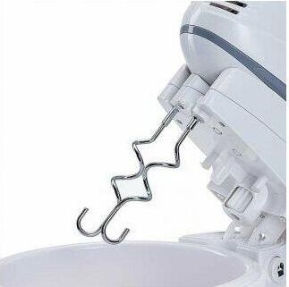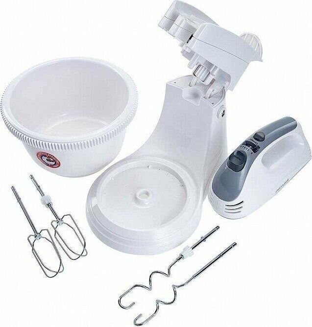 Максимальная мощность 400 Вт. Номинальная потребляемая мощность 200 Вт. Объем чаши 2 л. Миксер электрический с чашей предназначен для смешивания жидких и сыпучих продуктов, приготовления соусов и десертов (взбитых сливок, пудингов, коктейлей, майонеза) с помощью венчиков, а также для замешивания теста различной консистенции насадками для замешивания в бытовых и аналогичных условиях Цвет: белый с серым. Автоматически вращающаяся съемная чаша. Подставка с откидным механизмом. 2 венчика для взбивания яиц и крема. 2 насадки для замешивания тяжелого теста. Кнопка извлечения насадок. Резиновые противоскользящие ножки. 2 режима работы: ручной и стационарный. 5 скоростных режимов. Режим «ТУРБО».