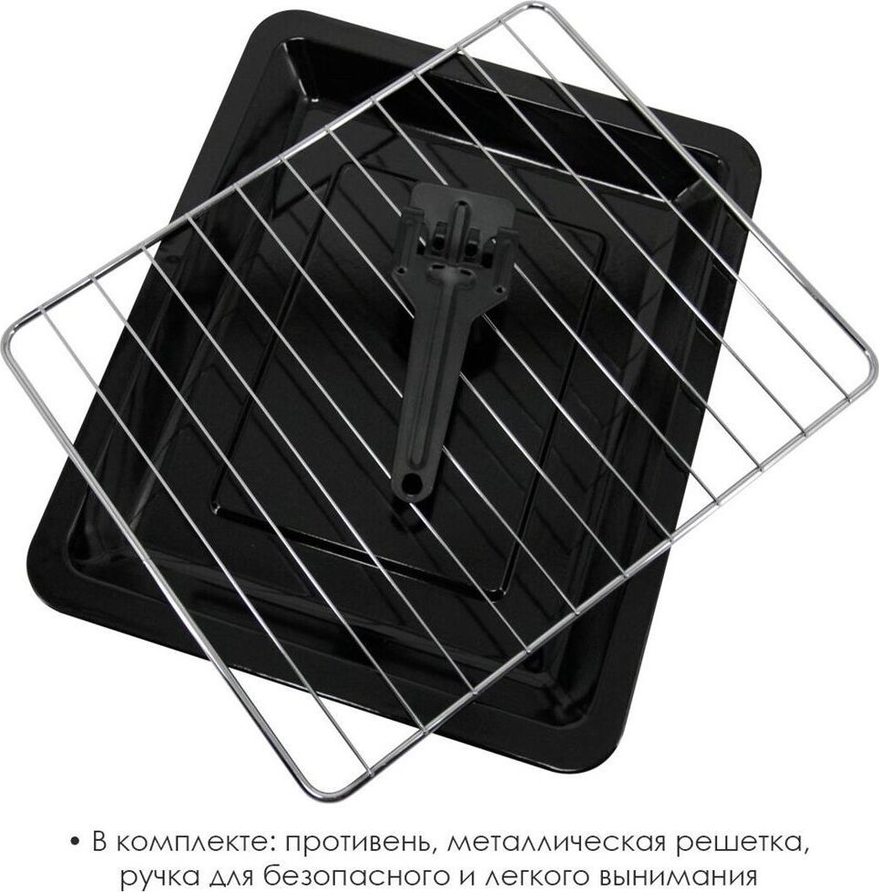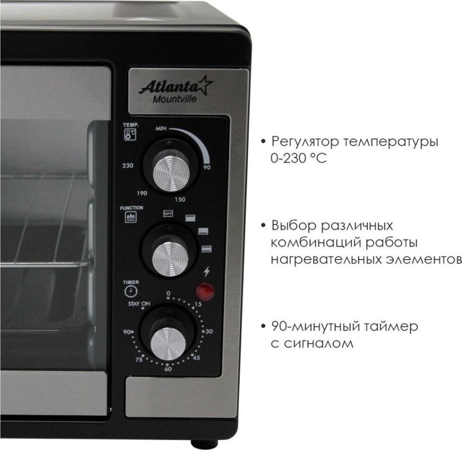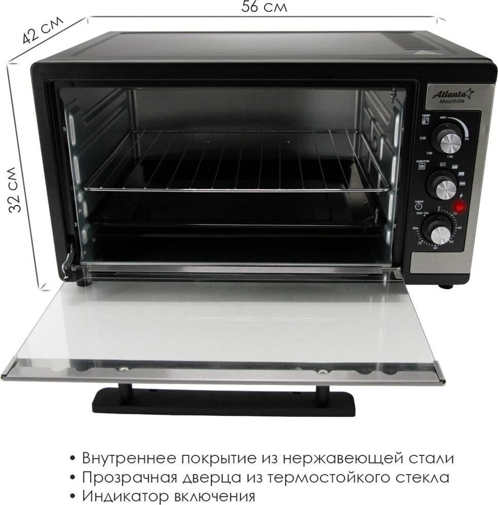 Объём 46 литров. Выбор различных комбинаций работы нагревательных элементов. Регулятор температуры 0-230 °C. Защита от перегрева. Световой индикатор работы. 60-минутный таймер с сигналом . Номинальная мощность 1500-1650 Вт. 220-240 B ~ 50 Гц.