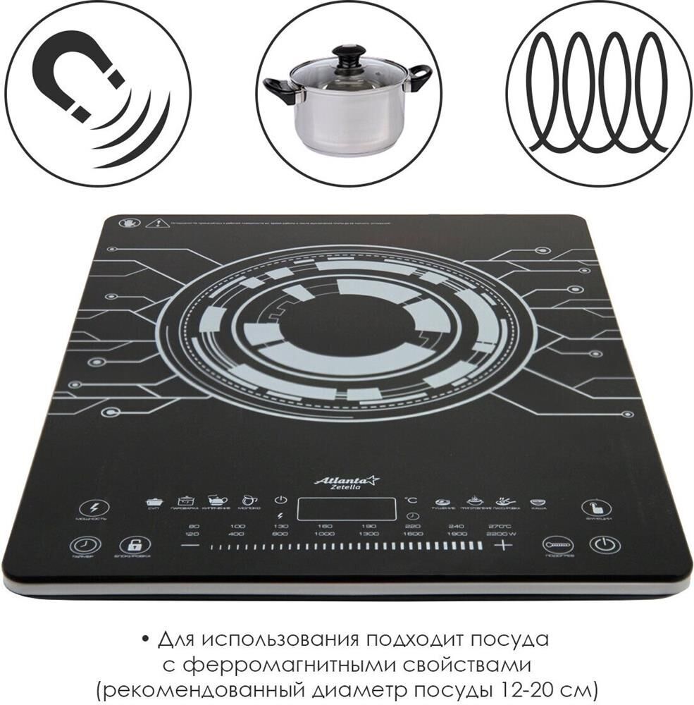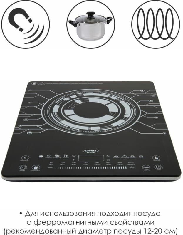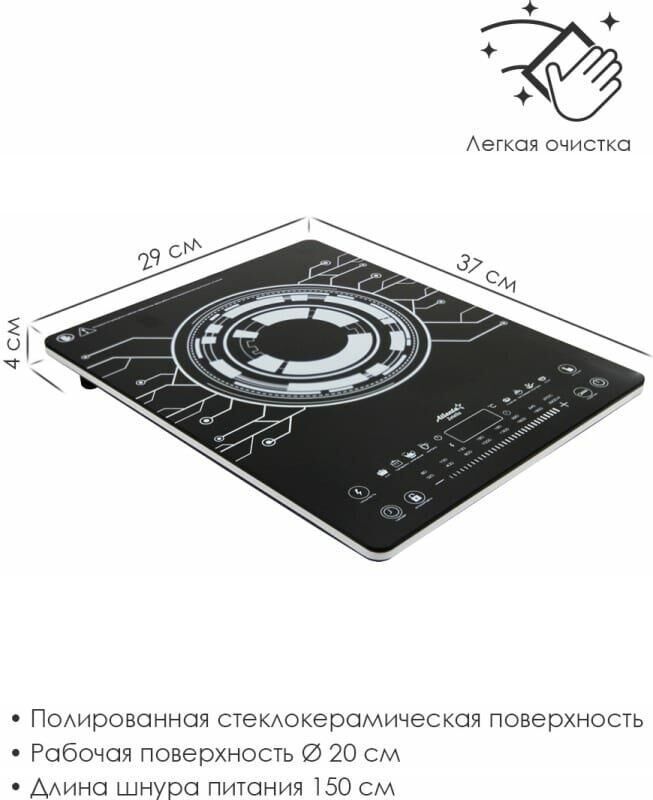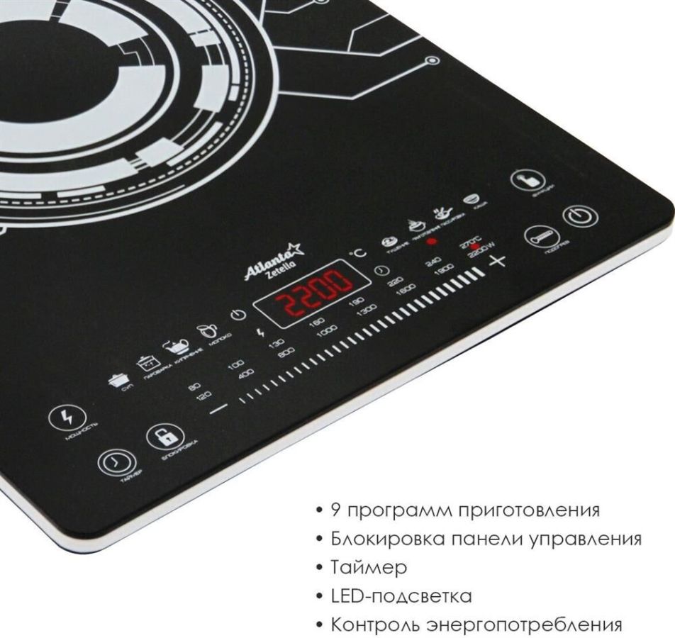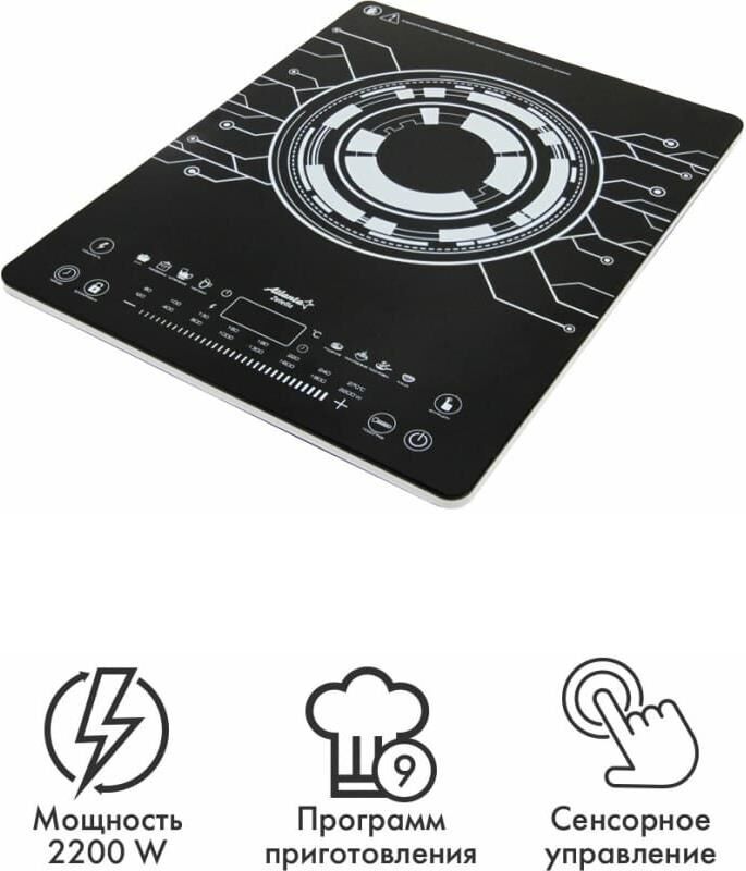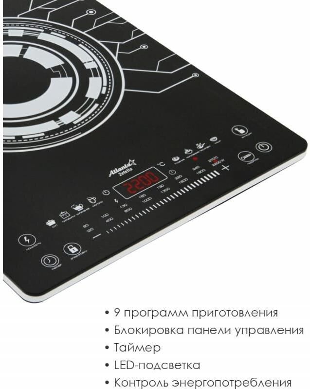 Полированная стеклокерамическая поверхность 290*370 мм. 9 программ приготовления пищи. Сенсорное управление. Высококачественного биполярный IGBT транзистор производства Siemens. Сверхширокий диапазон напряжения. Таймер включения и выключения. Функция замера мощности и напряжения. Защита от перегрева. Номинальная мощность 2000 Вт. 230 B ~ 50 Гц.