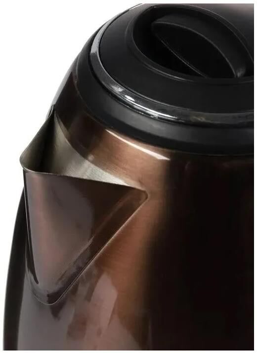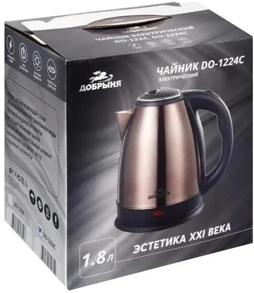 Объём: 1,8 л. Материал корпуса: нержавеющая сталь. Крышка: термостойкий, пищевой пластик. Мощность: 1500-1800 Вт. Автоотключение при закипании и отсутствии воды. Закрытый нагревательный элемент. Поворот на подставке на 360 градусов. Световой индикатор работы. Наличие места для хранения шнура Напряжение: 230 В, 50 Гц