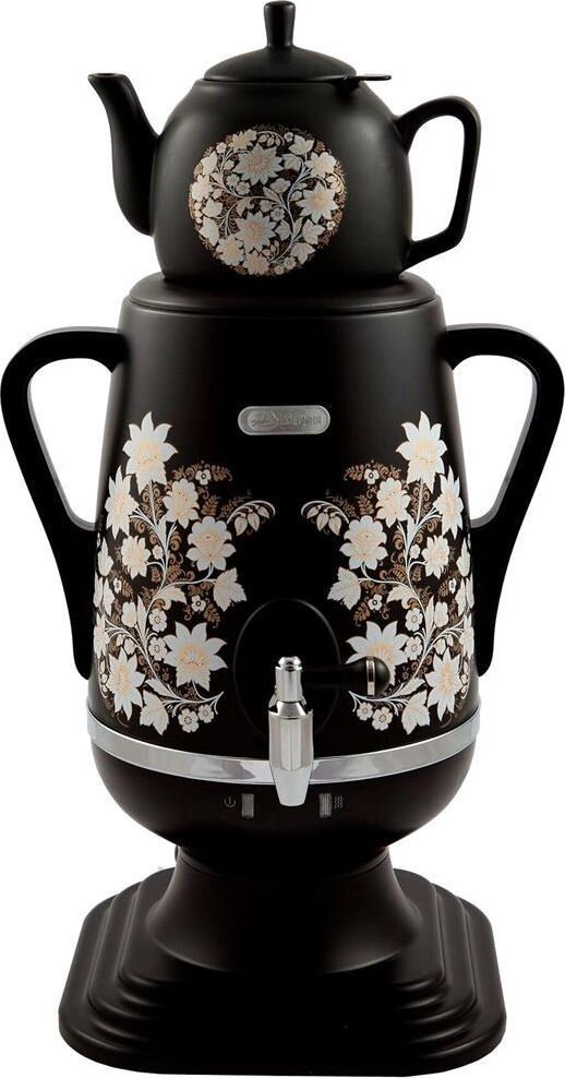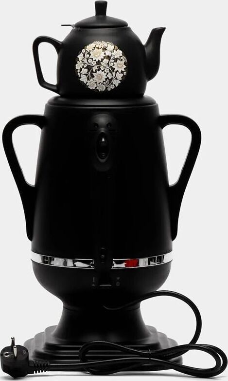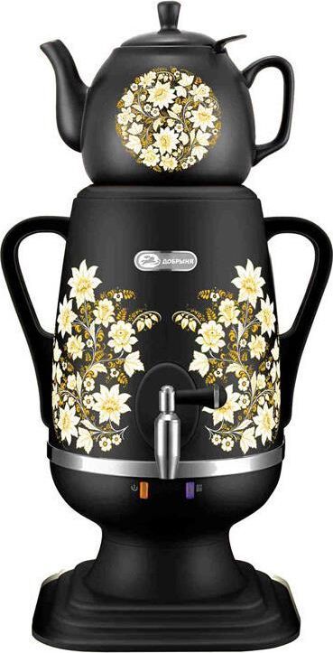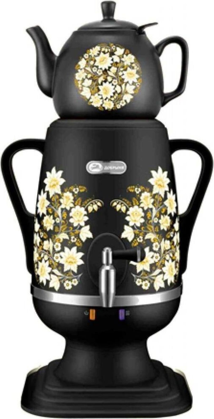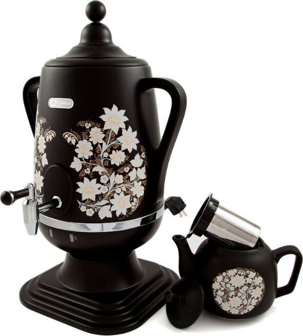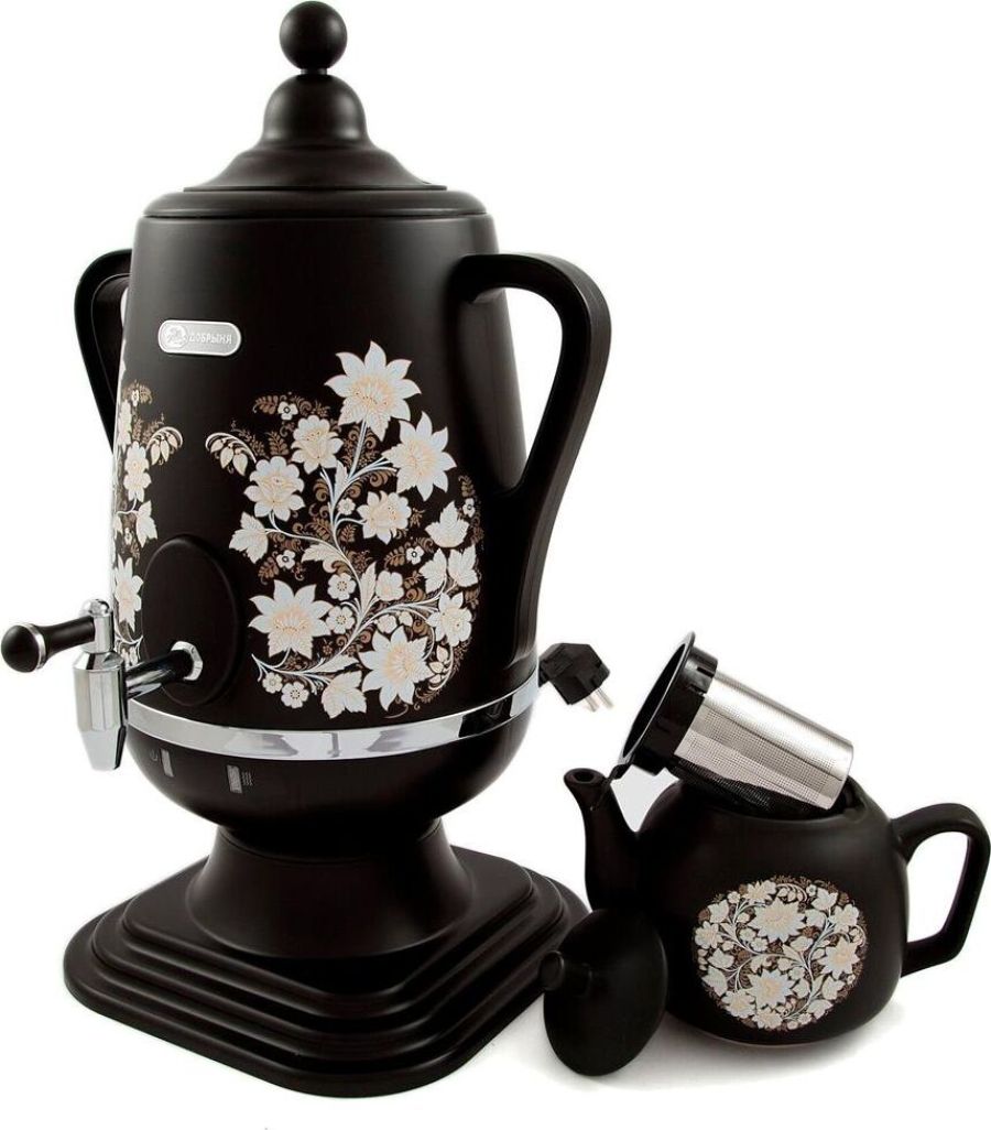 Объём: 4 л. Материал: пластик. Цвет: чёрный с росписью. Керамический заварочный чайник 1 л со съёмным фильтром из нержавеющей стали в комплекте/высота 145мм. Хромированный кран. Функция термопота. Мощность при закипании 1850 Вт. Мощность в режиме подогрева 100 Вт. Напряжение сети 220 В Дисковый нагреватель, световая индикация работы, автоматическое отключение, защита от перегрева при выкипании воды