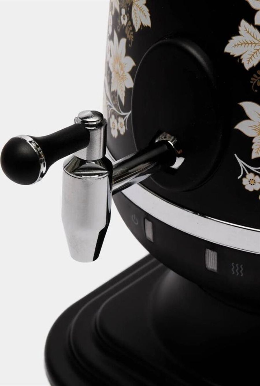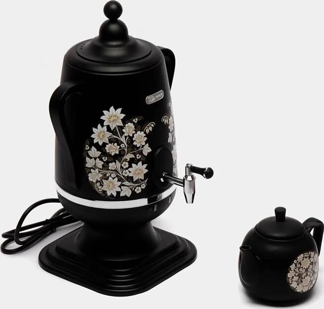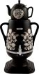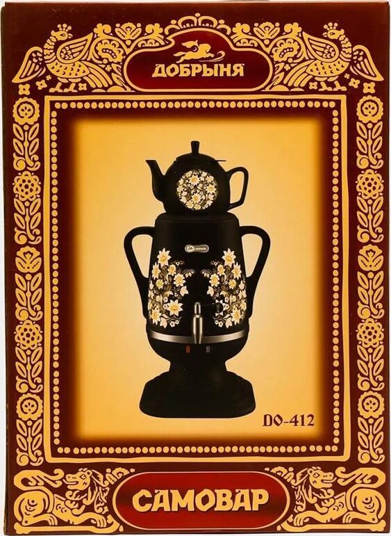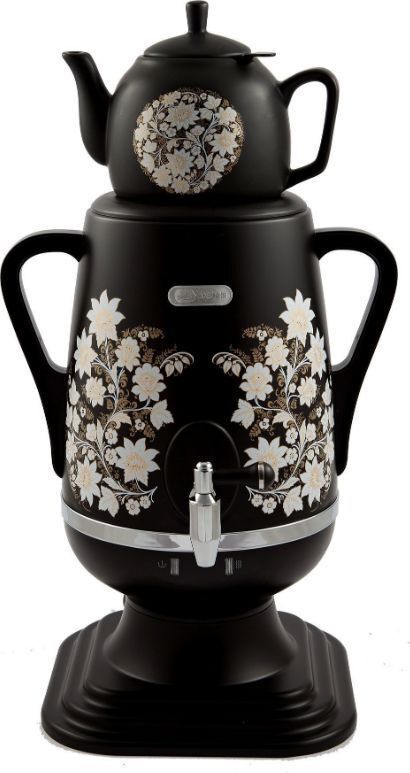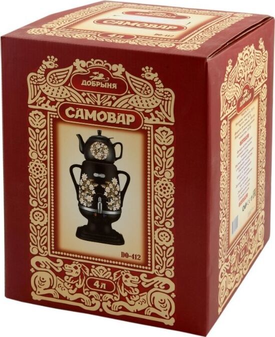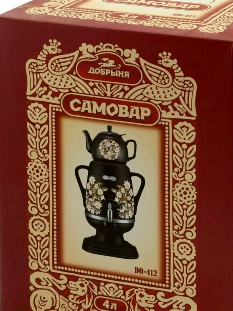 Объём: 4 л. Материал: пластик. Цвет: чёрный с росписью. Керамический заварочный чайник 1 л со съёмным фильтром из нержавеющей стали в комплекте/высота 145мм. Хромированный кран. Функция термопота. Мощность при закипании 1850 Вт. Мощность в режиме подогрева 100 Вт. Напряжение сети 220 В Дисковый нагреватель, световая индикация работы, автоматическое отключение, защита от перегрева при выкипании воды
