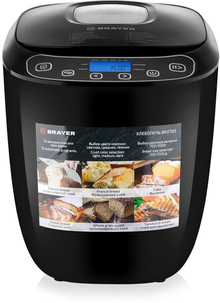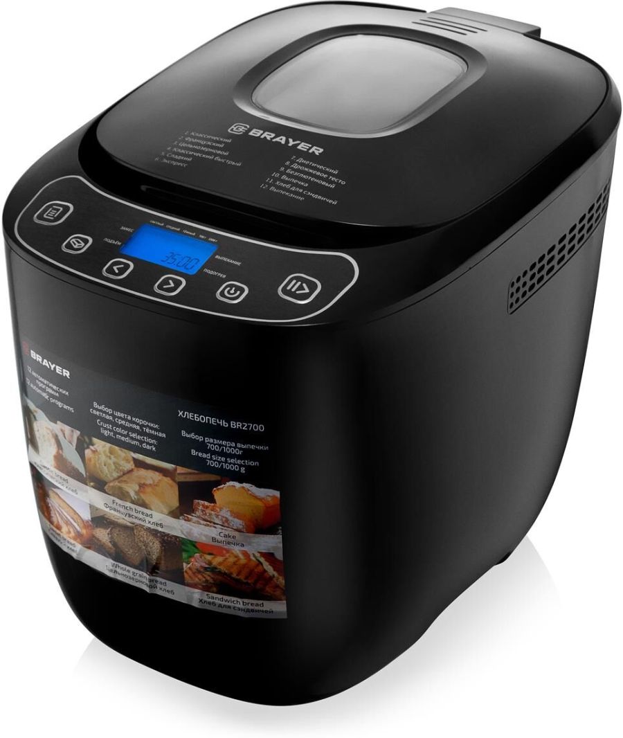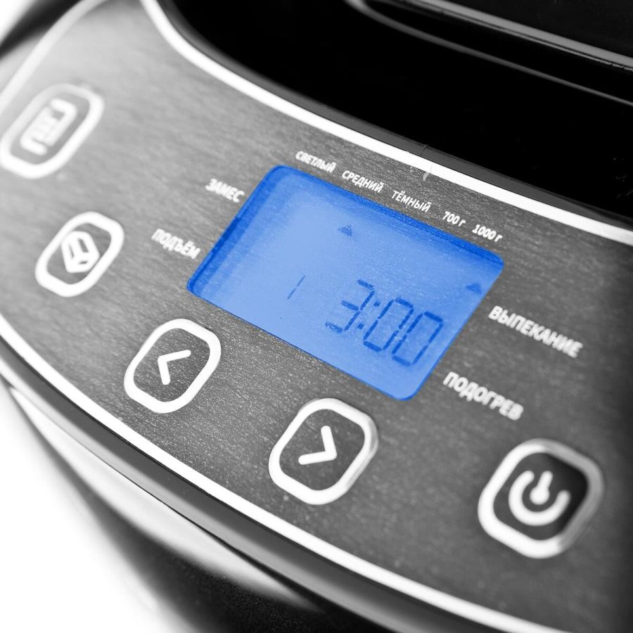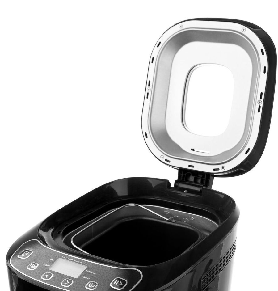 Мощность 550 Вт. 12 автоматических программ. Выбор размера выпечки 700/1000 гр. Пластиковый корпус. Форма для выпечки с антипригарным покрытием и лопастью для замеса теста. Мерные ложка и стакан. Книга рецептов в комплекте. Функция выбора цвета корочки: светлая, средняя, тёмная. Функция памяти до 10 минут. Добавление дополнительных ингредиентов. Звуковой сигнал по окончании работы. Таймер – отсрочка запуска 13 часов. Защита от перегрева. Поддержание температуры после выпекания 60 мин. Электропитание 220-240В., 50 Гц..