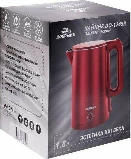 Объем 1,8л. Мощность: 1800-2200 Вт. -Автоотключение при закипании воды -Возможность поворота на 360 градусов -Закрытый нагревательный элемент -Сетевой индикатор работы -Место для хранения шнура -Напряжение 230 Вт, 50 Гц.