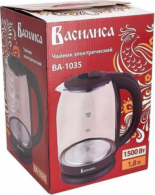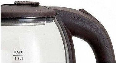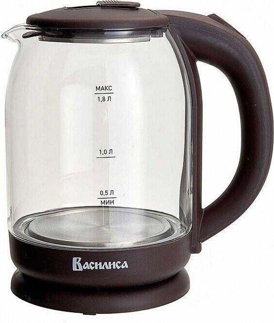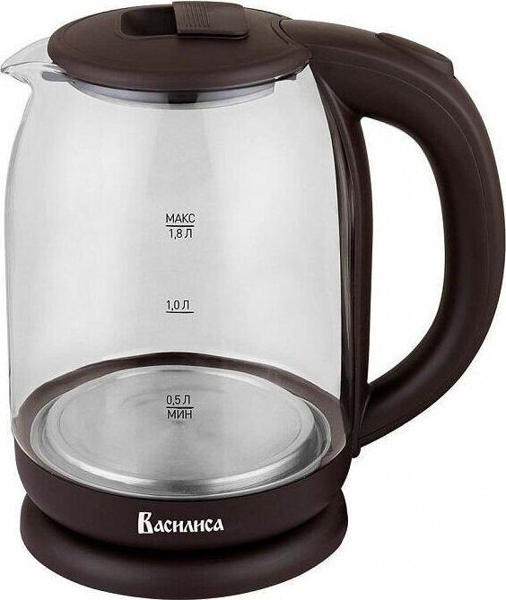 Объем 1,8 л. Номинальная потребляемая мощность 1500 Вт. Корпус из высококачественного термостойкого стекла. Закрытый нагревательный элемент из нержавеющей стали. Вращение корпуса на 360°. Цвет: коричневый. Шкала уровня воды. Внутренняя LED-подсветка. Отсек для хранения электрошнура. Автоматическое отключение при закипании. Блокировка включения без воды.