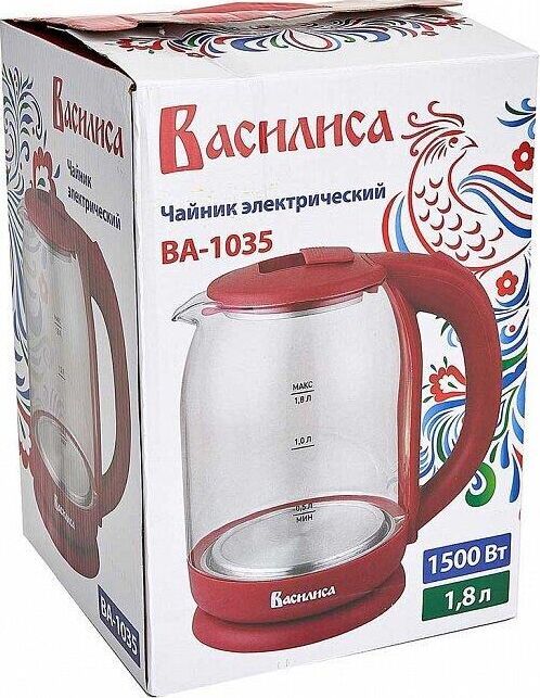 ВАСИЛИСА ВА-1035 стекло бордовый Параметры Объем 1,8 л Номинальная потребляемая мощность 1500 Вт Описание Корпус из высококачественного термостойкого стекла Закрытый нагревательный элемент из нержавеющей стали Вращение корпуса на 360° Цвет: бордовый Шкала уровня воды Внутренняя LED-подсветка Отсек для хранения электрошнура Автоматическое отключение при закипании Блокировка включения без воды Упаковка: цветная коробка