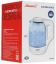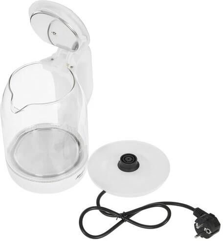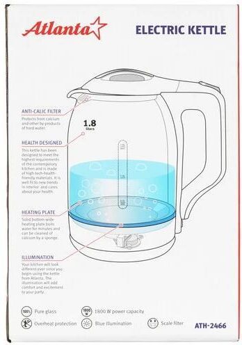 Корпус из термостойкого стекла.Объем 1,8 литра.Иллюминация .Специальная ручка от скольжения.Поворот на подставке на 360° .Быстрое закипание. Фильтр от накипи .Закрытый нагревательный элемент. Автоматическое отключение. Защита от перегрева без воды. Электрошнур в цокольной подставке, 55 см. Номинальная мощность 1800 Вт230 B ~ 50 Гц.