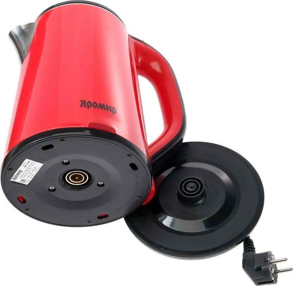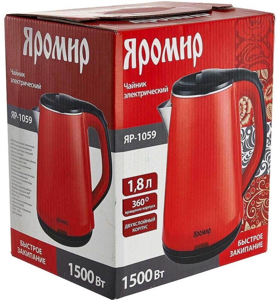 Объем 1,8 л. Номинальная потребляемая мощность 1500 Вт. Чайник электрический предназначен для нагревания воды в бытовых и аналогичных условиях. Двухслойный корпус: внутренняя колба из высококачественной нержавеющей стали и внешний корпус из пластика. Цвет: красный с черным. Закрытый нагревательный элемент из нержавеющей стали. Вращение корпуса на 360°. Отметка максимального и минимального уровня воды внутри корпуса. Световой индикатор работы. Отсек для хранения электрошнура. Автоматическое отключение при закипании. Блокировка включения без воды.