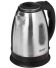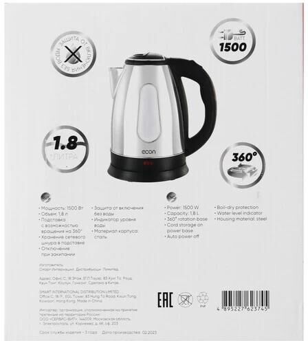 Максимальный объем, л. 1,8. Тип нагревательного элемента диск. Способ открывания крышки вручную. Подставка с вращением на 360 есть. Хранение сетевого шнура в подставке есть. Отключение при закипании есть. Отключение при отсутствии воды есть. Индикатор уровня воды есть. Комплектация чайник, гарантийный талон, инструкция на русском языке. Материал корпуса нержавеющая сталь. Цвет сталь с черными вставками. Потребляемая мощность, Вт. 1500. Электропитание, В., Гц. 220-240, 50.
