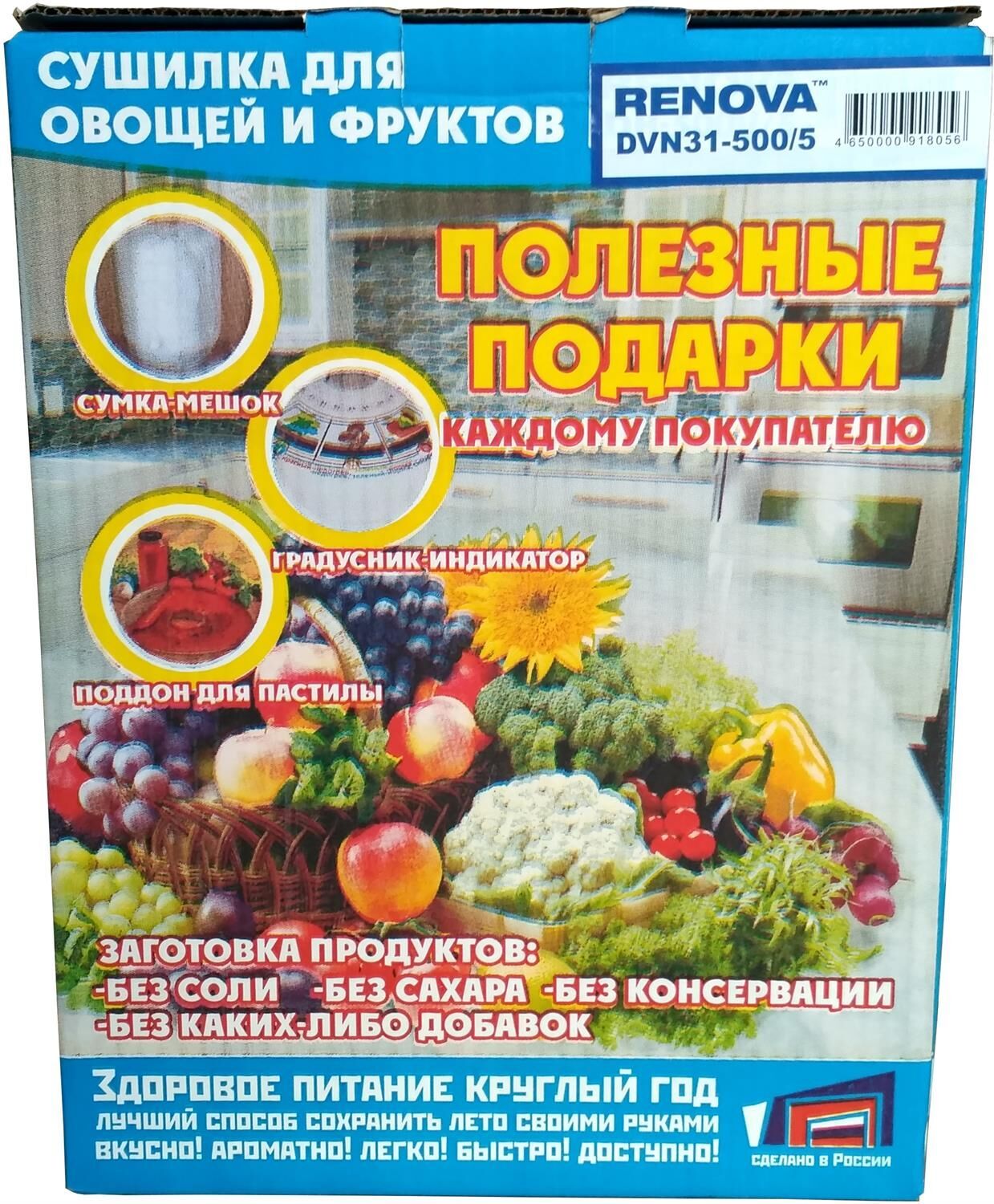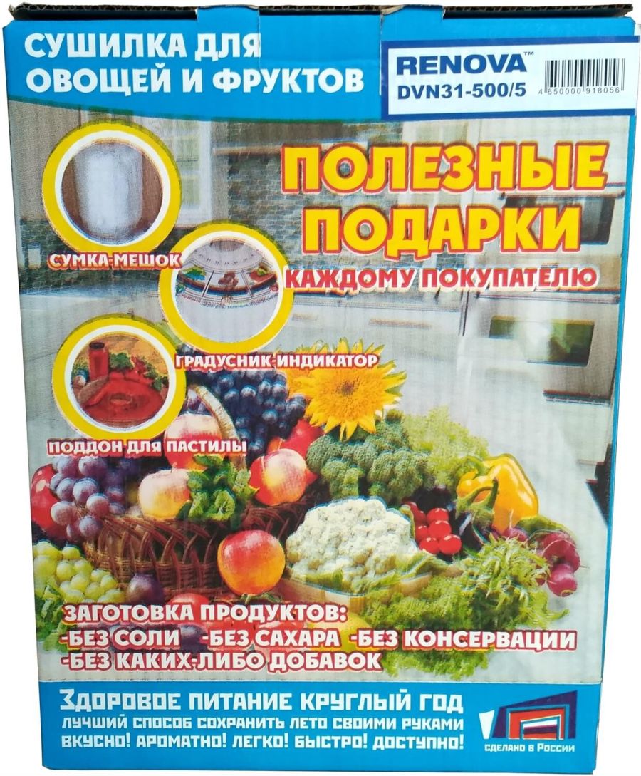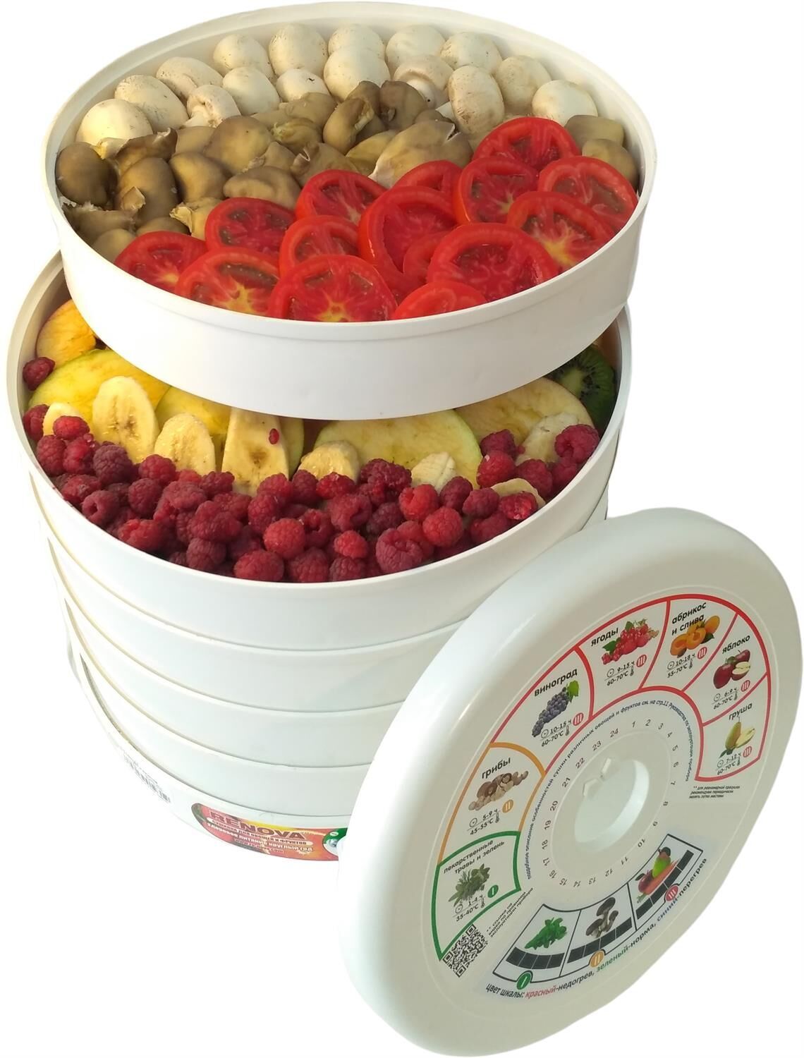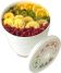 (ШхГхВ) 30,5х30,5х39,5см.5 поддонов для овощей и фруктов.Форма корпуса цилиндрическая.Диаметр поддона для овощей и фруктов 305мм.Полезный объем 15л.Мощность нагревательного элемента 500Вт.Мощность вентилятора 16Вт.Регулировка температуры 30-70С (в нижнем поддоне).Степень защиты от доступа воды IP20.Вес 3,1кг.