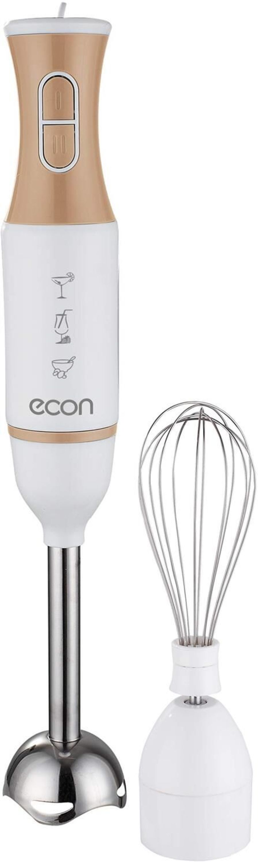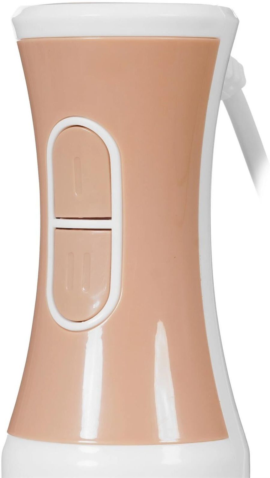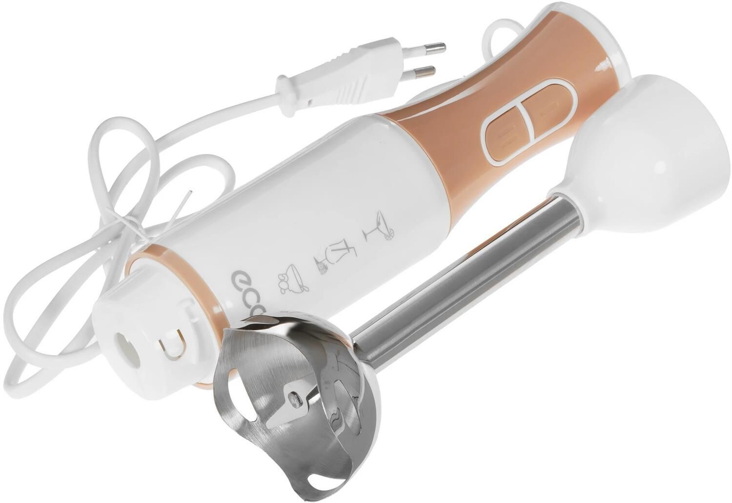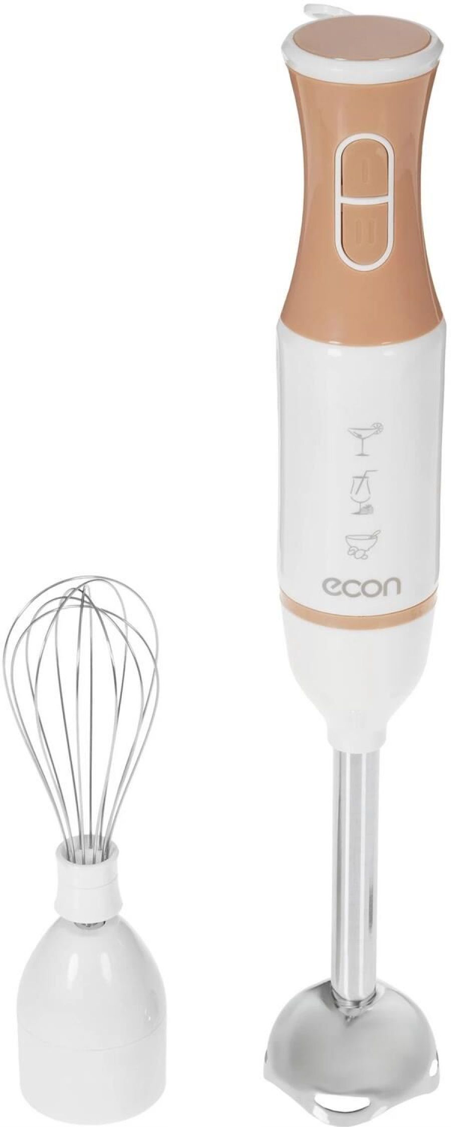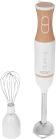Блендер погружной, максимальная мощность 700 Вт, 2 скорости, импульсный режим работы, насадка-блендер из нержавеющей стали, съемная насадка-венчик из нержавеющей стали, цвет белый с кофейным