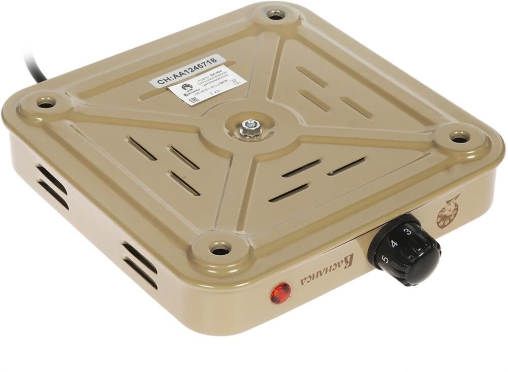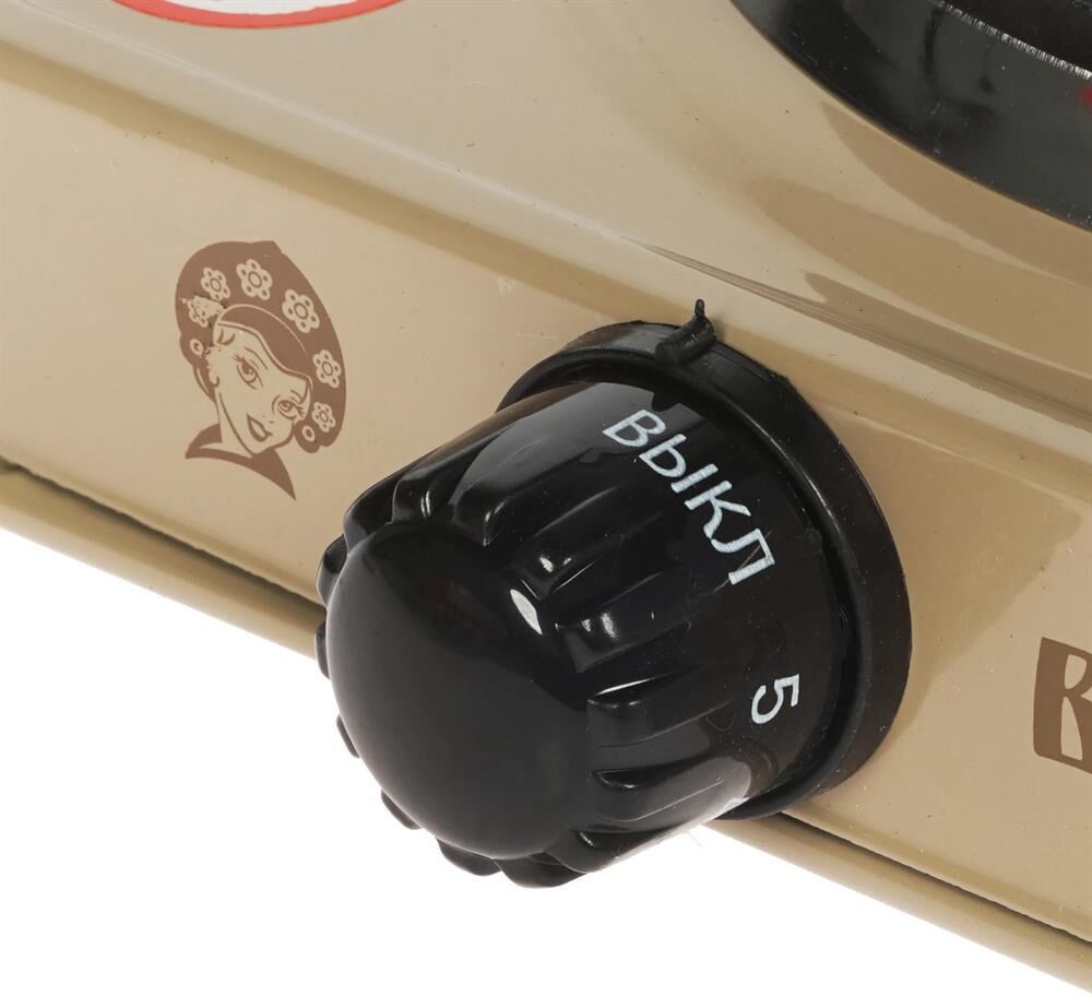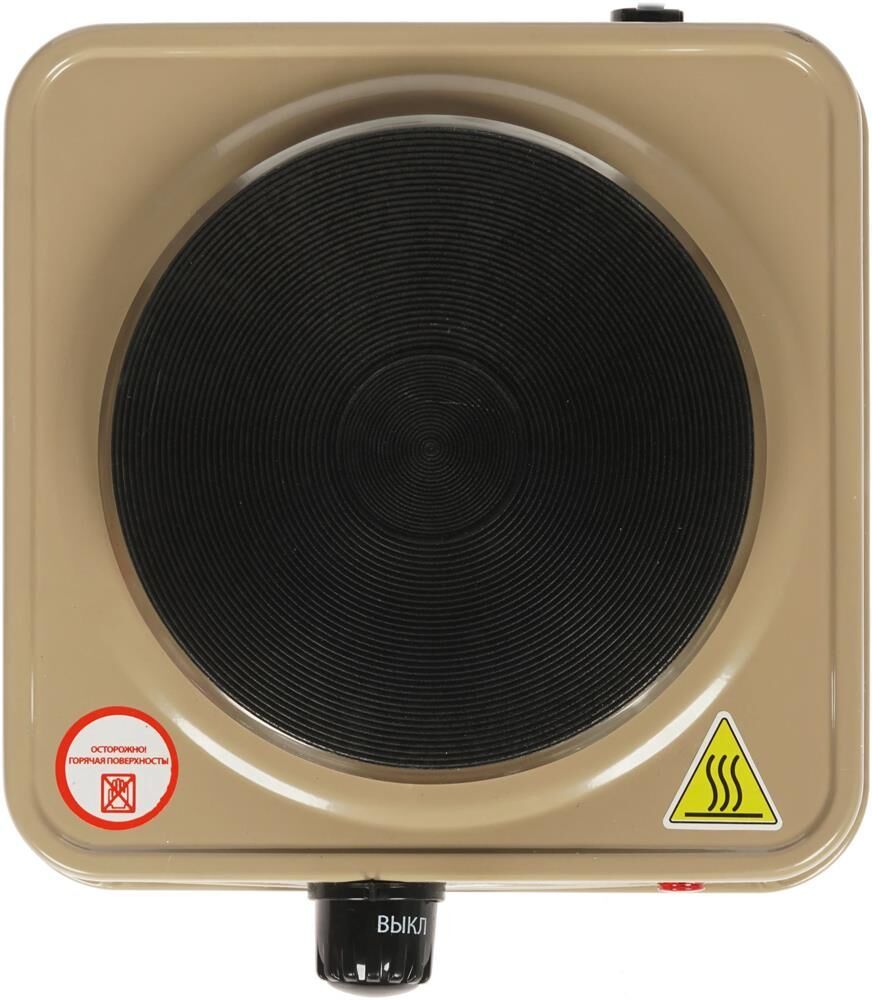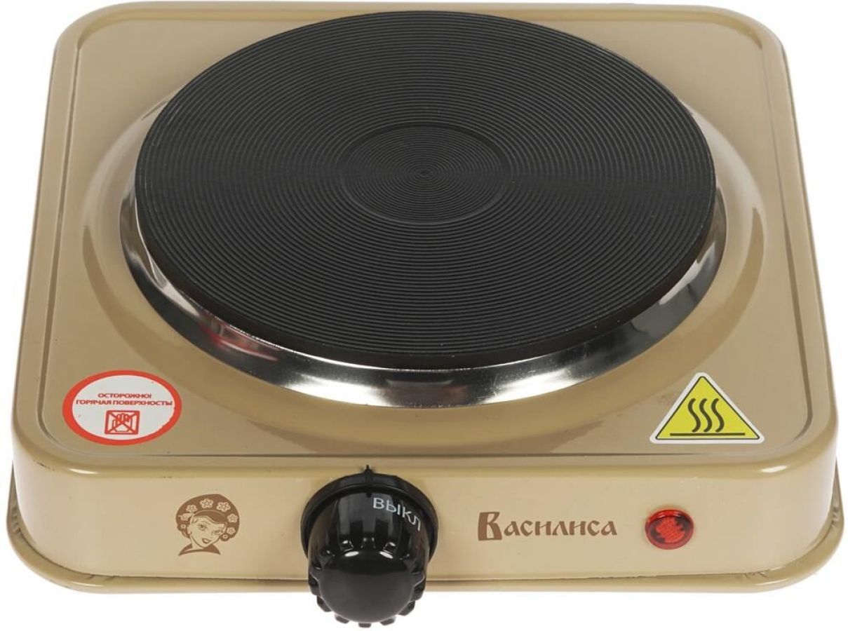 Номинальная потребляемая мощность 1000 Вт, Количество конфорок 1 штука, Вид конфорок диск, Эмалированная рабочая поверхность, Цвет эмали: бежевый, Поворотный механический переключатель, Световой индикатор работы, Терморегулятор, Упаковка: цветная коробка.