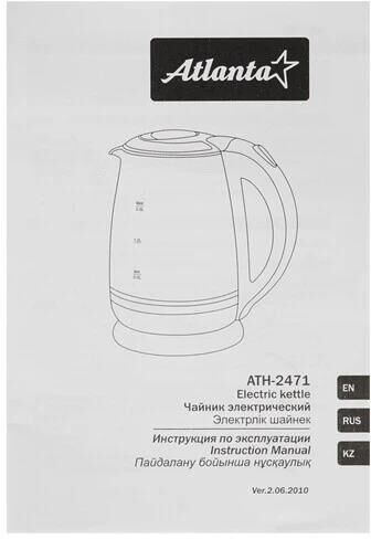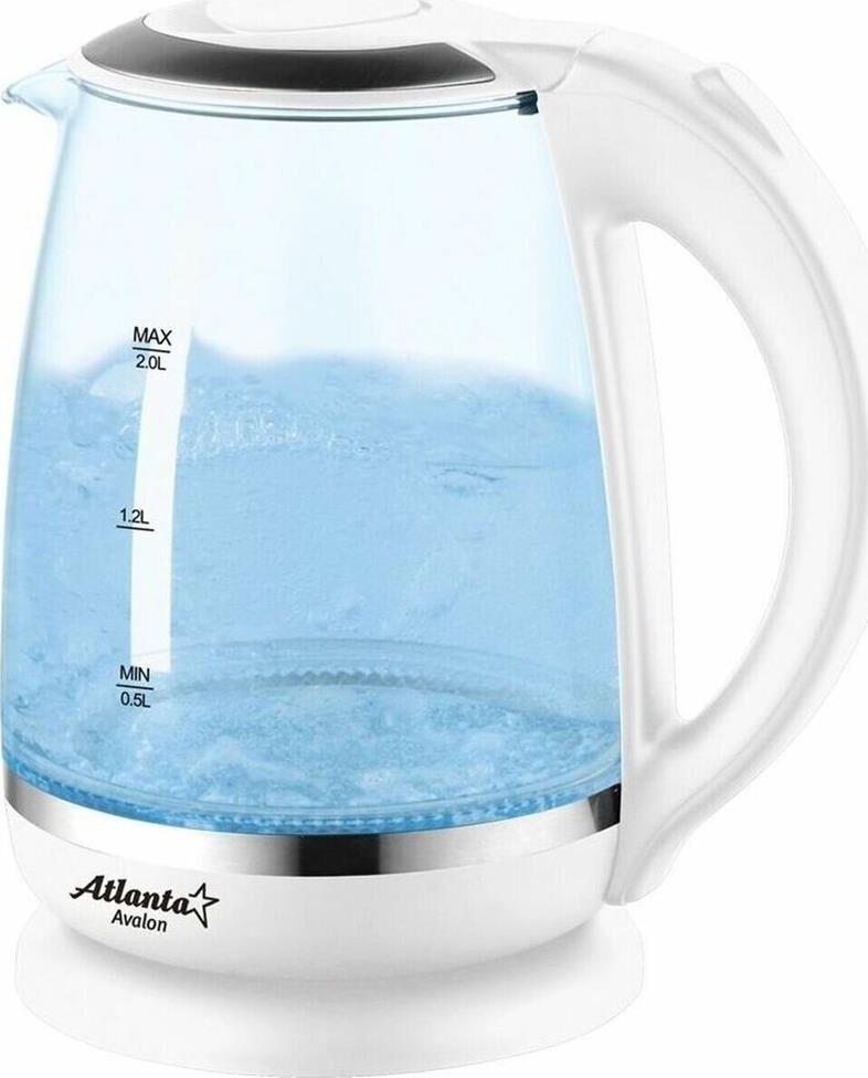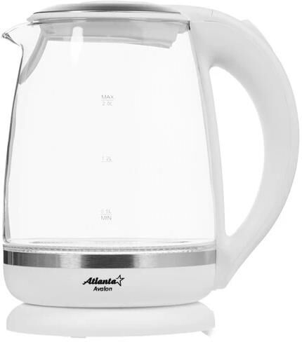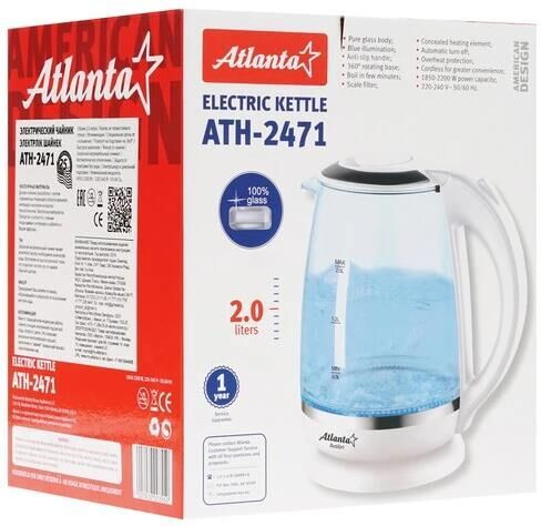 ATLANTA ATH-2471 (WHITE) Чайник стеклянный электрический Объем 2.0 литра Корпус из термостойкого стекла Иллюминация Специальная ручка от скольжения Поворот на подставке на 360° Быстрое закипание Фильтр от накипи Закрытый нагревательный элемент Автоматическое отключение Защита от перегрева без воды Электрошнур в цокольной подставке. 67см Номинальная мощность 1850-2200 Вт 220-240 B ~ 50/60 Гц