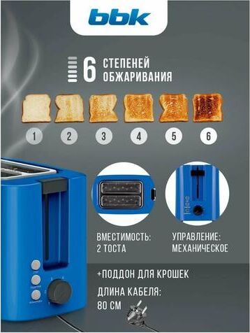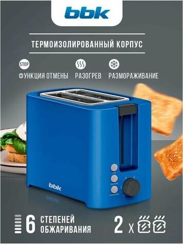 Мощность 800Вт; Отделения для двух тостов; 6 режимов приготовления; Клавиша отмены; Функция подогрева, Функция разморозки. Регулировка степени поджаривания; Термоизолированный корпус; Защита от перегрева; Съемный поддон для крошек