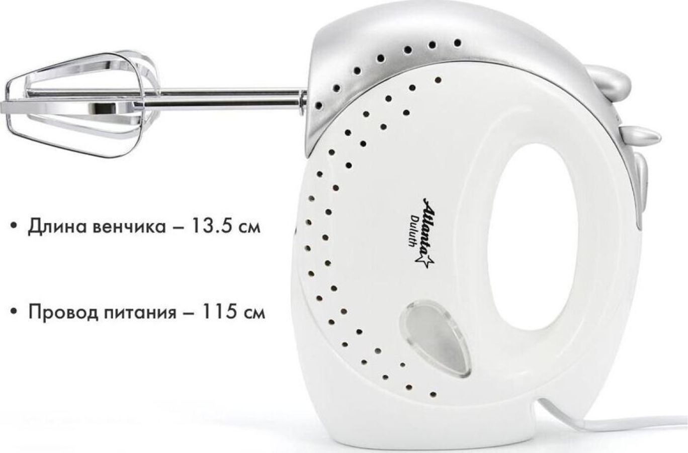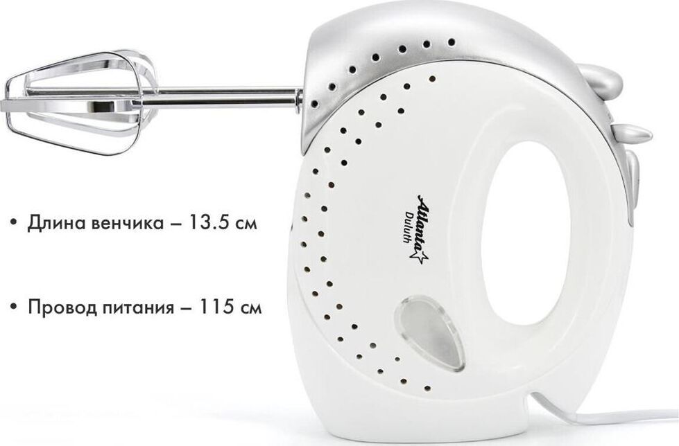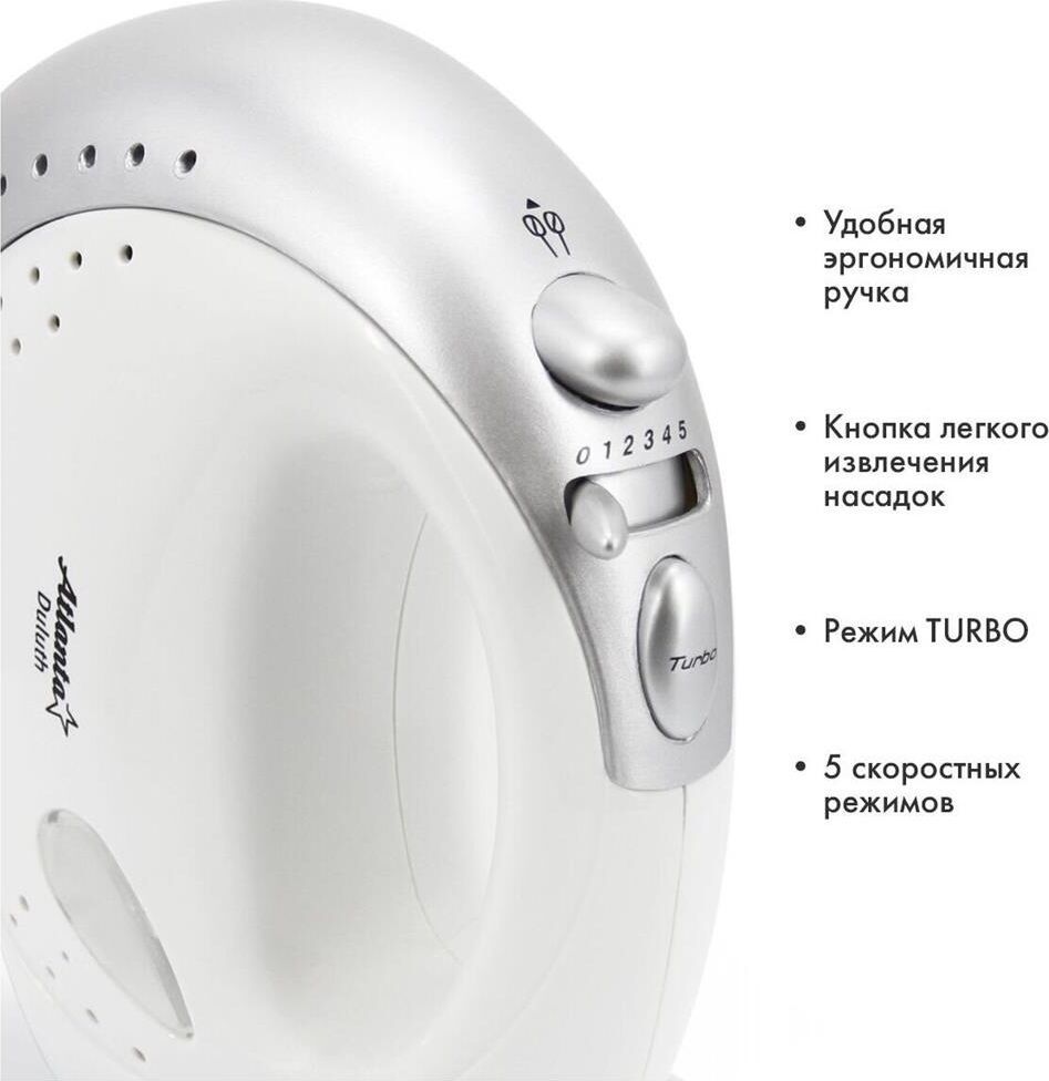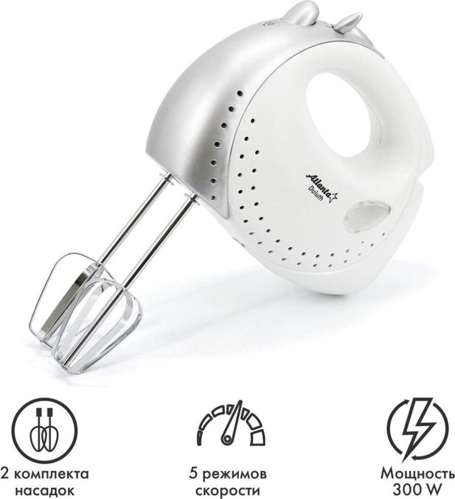 Номинальная мощность 300 Вт. Режим «Турбо». Два комплекта хромированных насадок. Кнопка легкого извлечения насадок. Пять скоростей. 230 B ~ 50 Гц
