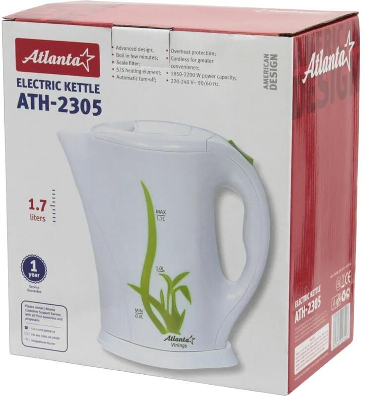 Объем 1,7 литра, Современный дизайн, Быстрое закипание, Фильтр от накипи , ТЭН из нержавеющей стали, Автоматическое отключение, Защита от перегрева без воды, Электрошнур в цокольной подставке, Номинальная мощность 1850-2200 Вт. 220-240 B ~ 50 Гц.