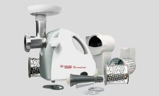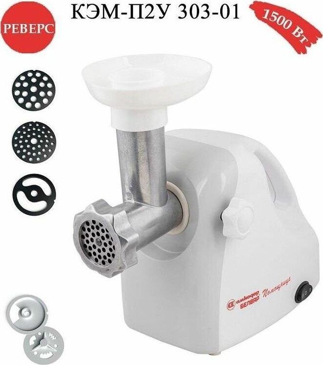 Электромясорубка КЭМ-П2У 303 (с ручкой) Пиковая мощность: 220Вт Номинальная мощность: 1500Вт Реверс: есть Цвет: бело-серый Решетки: 1