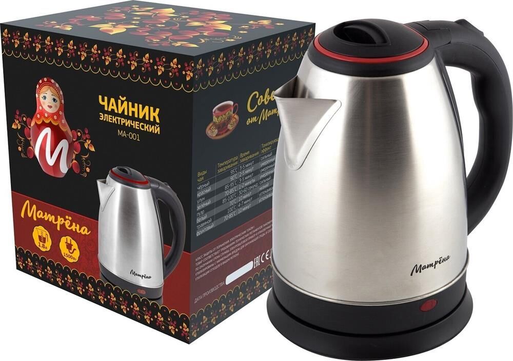 МАТРЁНА MA-001нержавейка красный "Объем: 1,8л Корпус из нержавеющей стали (промо) Автоотключение при закипании Защита от работы без воды Возможность поворота на подставке на 360 Закрытый нагревательный элемент из нержавеющей стали Мощность: 1500Вт Напряжение: 220-240В, 50-60Гц"