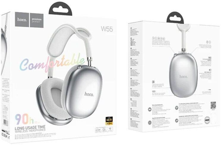 Hoco W55 — стильные беспроводные полноразмерные наушники для использования с ТВ, аудио, видео техникой, компьютером, телефоном или ноутбуком, обеспечивают беспроводную связь через версию Bluetooth 5.4. Наушники оснащены удобными, мягкими амбушюрами, в которых не чувствуется дискомфорт даже при длительном использовании. Гарнитура оснащена слотом для карты памяти, что дает возможность сделать из наушников аудиоплеер mp3. Устройство имеет емкость батареи: 800mAh, время работы в режиме использования составляет 90 часов, в режиме ожидания до 200 часов. Полная зарядка батареи займет около двух часов. Имеет два языка уведомлений английский и китайский.