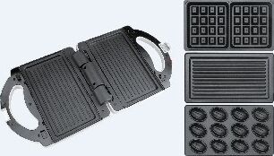 МУЛЬТИПЕКАРЬ. Мощность: 220-240 В, 50 Гц, 900 Вт 3 пары съемных металлических панелей с антипригарным покрытием: ВЕНСКИЕ ВАФЛИ, ГРИЛЬ, ОРЕШНИЦА. Материал корпуса; металл+пластик. Защита от поражения электротоком: класс I/ Индикатор нагрева. Раскрытие на 180 С. Легко чистится. Две расцветки: белый, черный