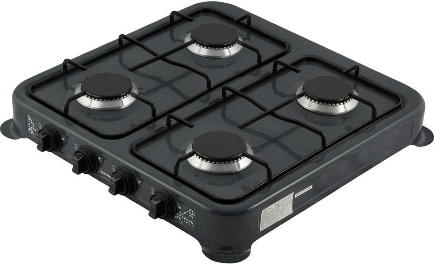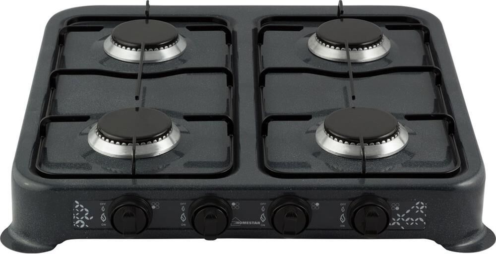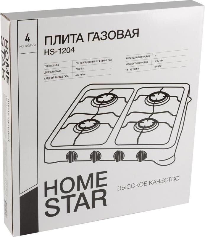 HOMESTAR HS-1204 (003701) Мощность: 4*3200 Вт Количество конфорок: 4 Давление газа: 2800 Pa Тип топлива: сжиженный нефтяной газ Материал корпуса: металл