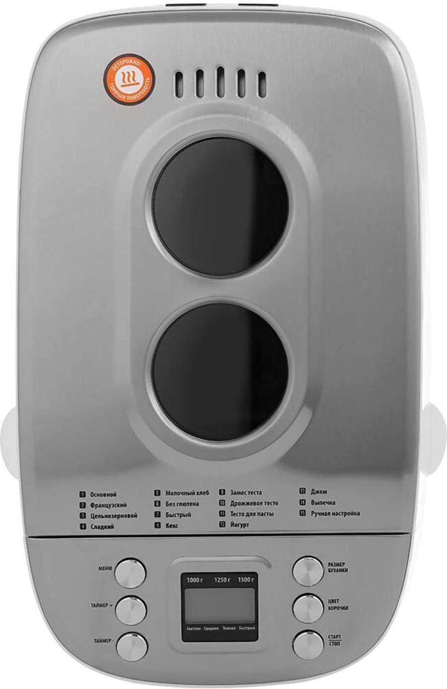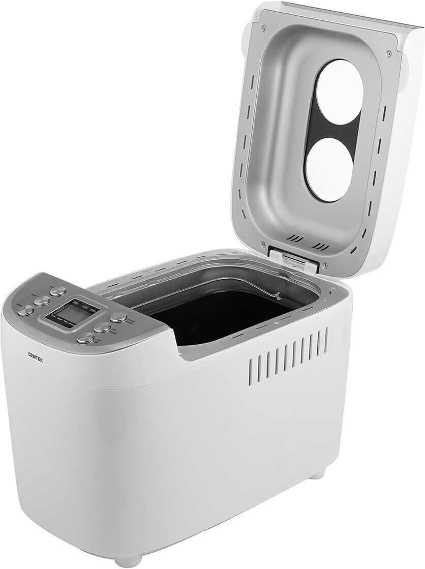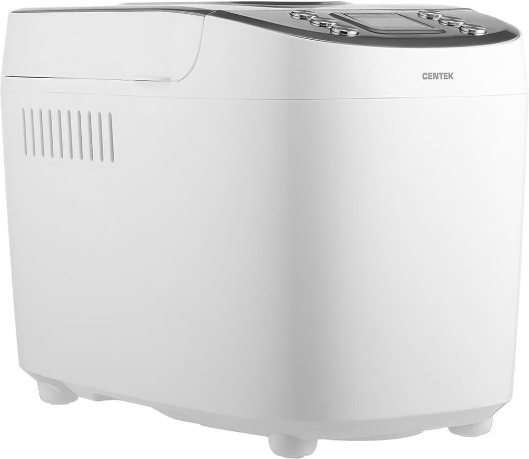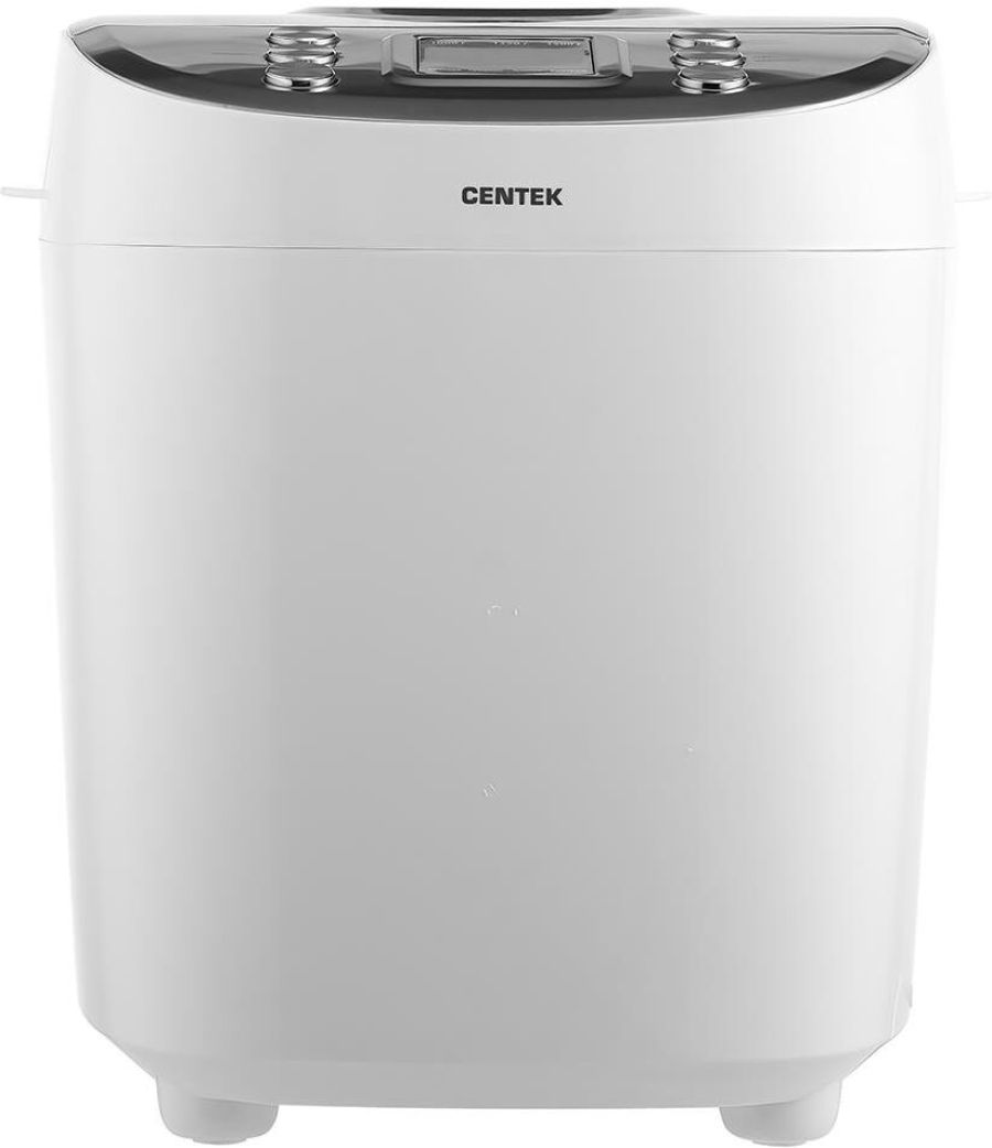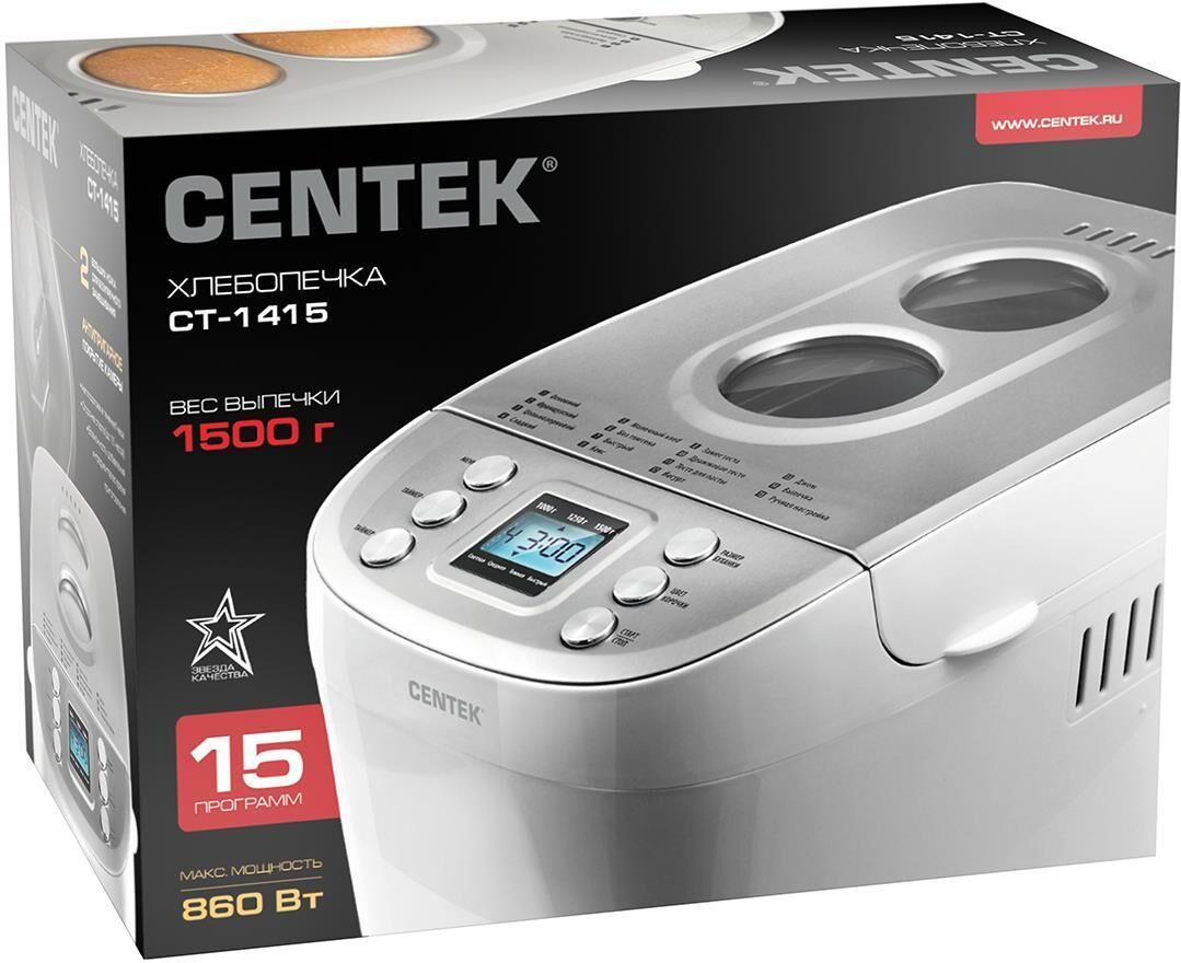 CENTEK CT-1415 Мощность860 Вт Вес выпечки1.5 кг Теплоизолированный корпус 2 ножа для замеса теста Звуковой сигнал Антипригарное покрытие пекарной камеры и ножей LCD-дисплей с подсветкой и цифровое управление Цвет корочки: светлый, средний, темный Защита от перегрева Съемный контейнер для запекания Автоматическая система подогрева в течение 1 часа Отсрочка старта15 ч. Отделка нержавеющей сталью Функция добавления ингредиентов во время приготовления Длина шнура1 м Запоминание выбранной программы в течение 15 минут после отключения электроэнергии даже без нажатия кнопки СТАРТ Аксессуары: мерный стаканчик, мерная ложка, крюк для вынимания пекарной камеры 15 автоматических программ: основной, французский хлеб, цельнозерновой, сладкий, молочный хлеб, без глютена, быстрый, кекс, замес теста, дрожжевое тесто, тесто для пасты, йогурт, джем, выпечка, ручная настройка