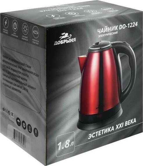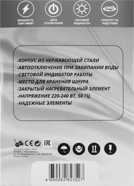 Объём: 1,8 л Материал корпуса: нержавеющая сталь Крышка: нержавеющая сталь Мощность: 1500-1800 Вт Автоотключение при закипании и отсутствии воды Закрытый нагревательный элемент Поворот на подставке на 360 градусов Световой индикатор работы Наличие места для хранения шнура Напряжение: 230 В, 50 Гц