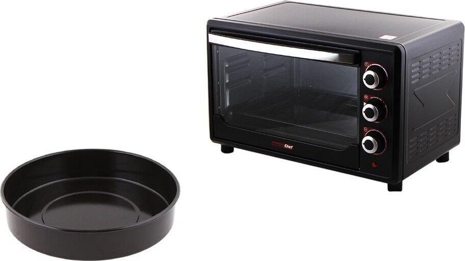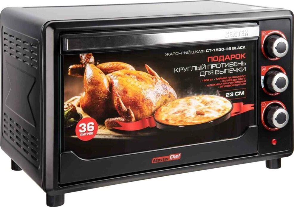 Жарочный шкаф Centek CT-1530-36 (черн)Мощность1600 Вт Объем жарочной камеры36 л Регулируемая температурадо 320 °С 4 режима приготовления Звуковой сигнал готовности Световой индикатор работы Хромированные поворотные переключатели Усиленные нагревательные элементы Плавный поворотный таймер на 90 мин с автоотключением и функцией непрерывной работы Комплект аксессуаров Круглый противень 23 см Жарочная решетка Стальной эмалированный противень Крюк для вынимания противня