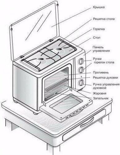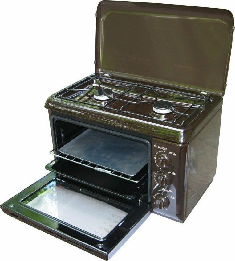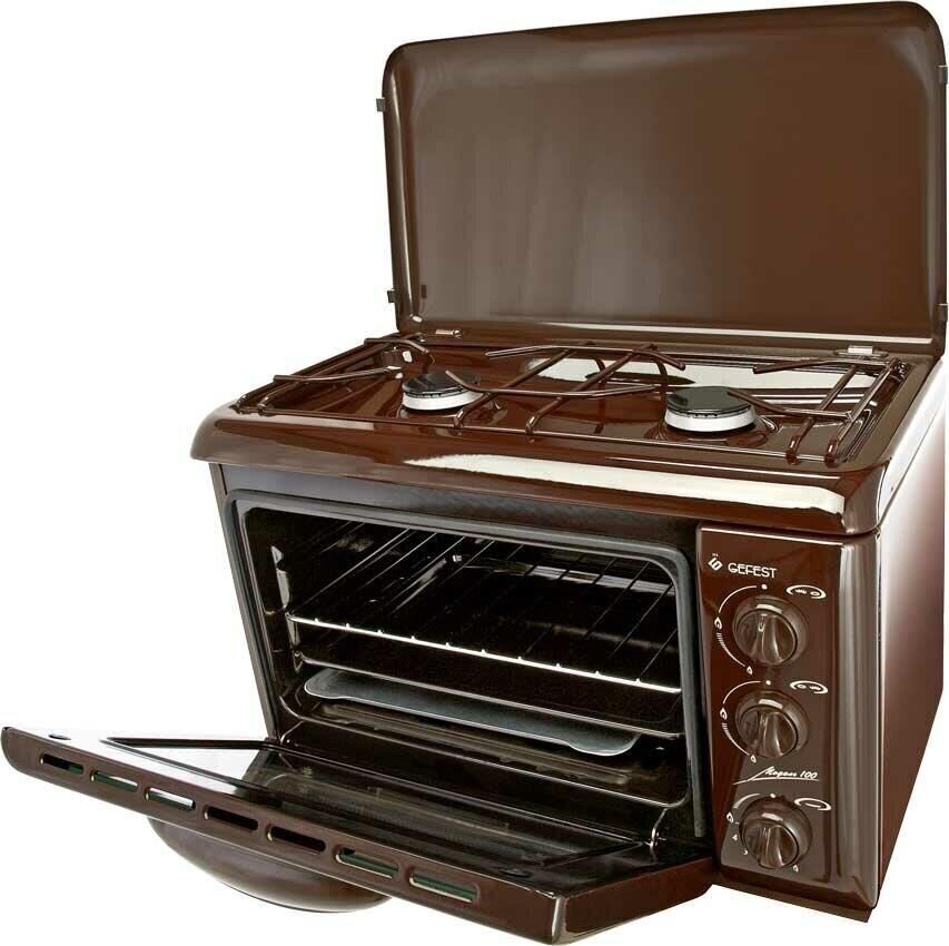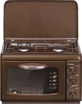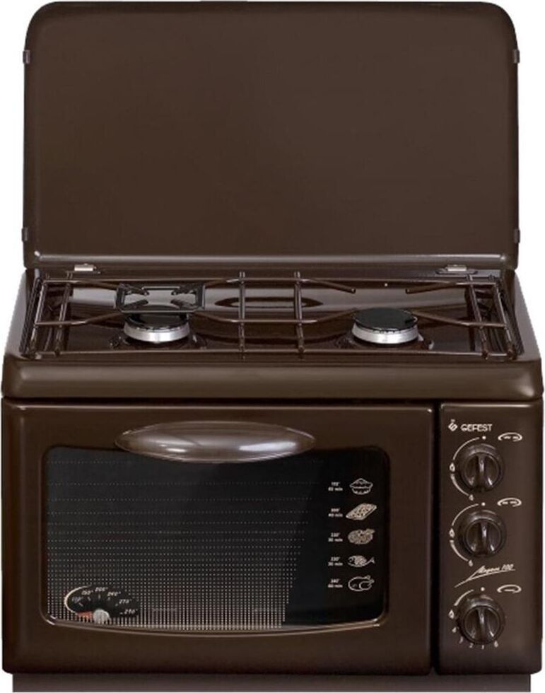 (ВхШхГ) 40х55х40см. 2 газовые горелки. Духовка газовая, объем 19л. Газ-контроль духовки. Фиксированное положение «малое пламя». Термоуказатель духовки. Двойное стекло дверцы духовки. Термостойкое эмалированное покрытие стола (корпуса). Коричневый.